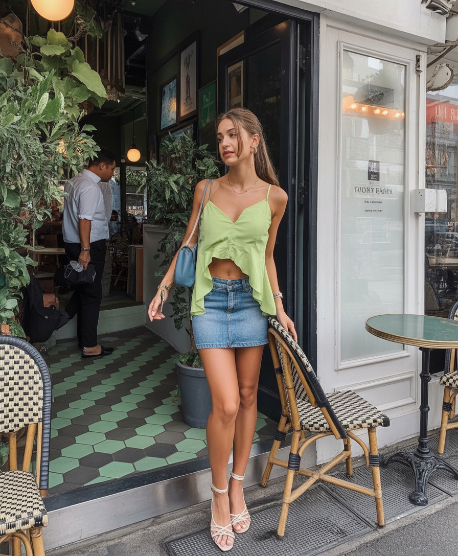 This look instantly gives that relaxed spring break energy you feel when you’re walking out of a café with nowhere to rush. The soft green top feels light, playful, and just a little flirty, while the denim mini keeps things grounded and easy. It has that effortless aesthetic that works whether you’re people-watching or heading out for a late lunch near the beach in California.