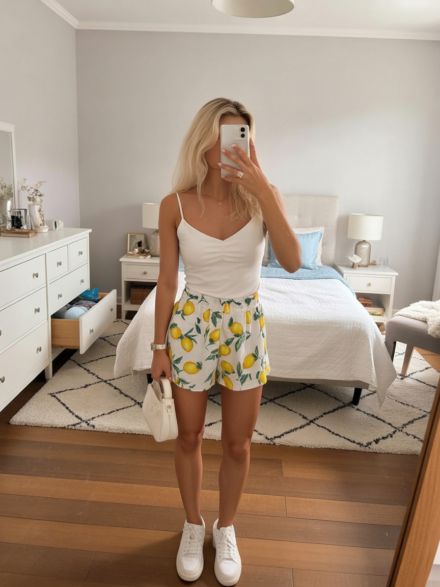 This look feels light, cheerful, and effortlessly happy. The lemon print shorts add a playful twist, while the simple white tank keeps everything balanced and clean. It’s casual in the best way—relaxed, approachable, and perfect for slow mornings or spontaneous plans.