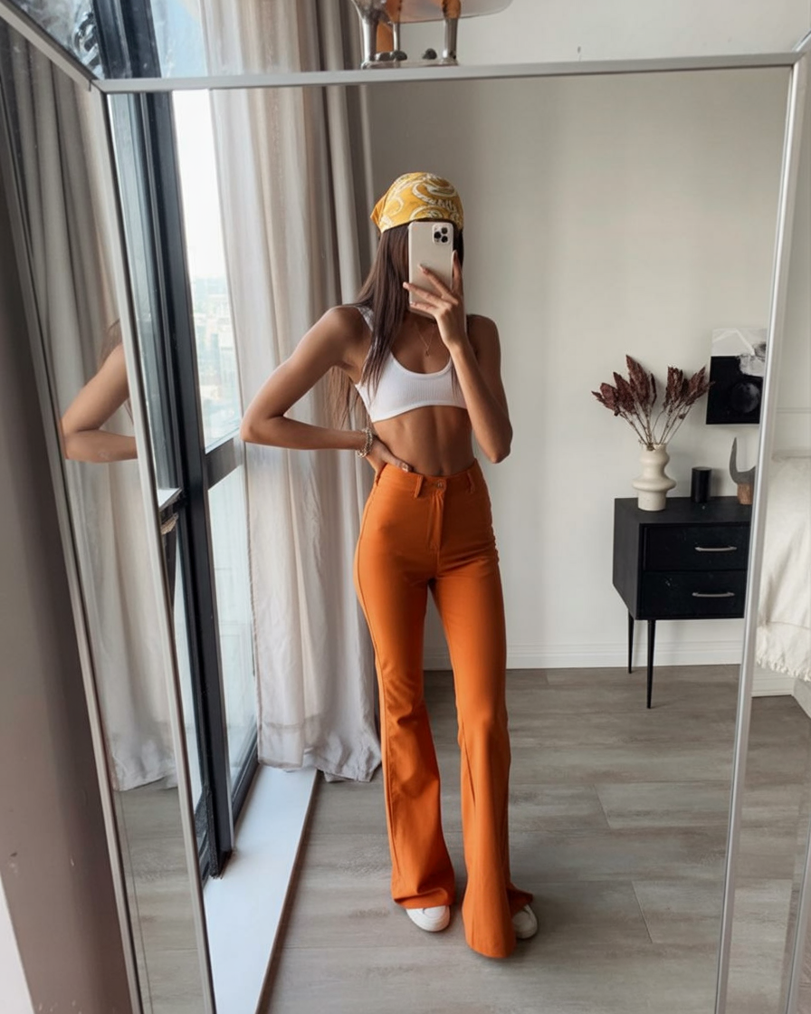 This look feels bold, artistic, and full of personality. The clean white crop top keeps things simple, while the orange flared pants steal the show with color and movement. It has that confident, expressive aesthetic that feels perfect for creative moods and standout moments.
