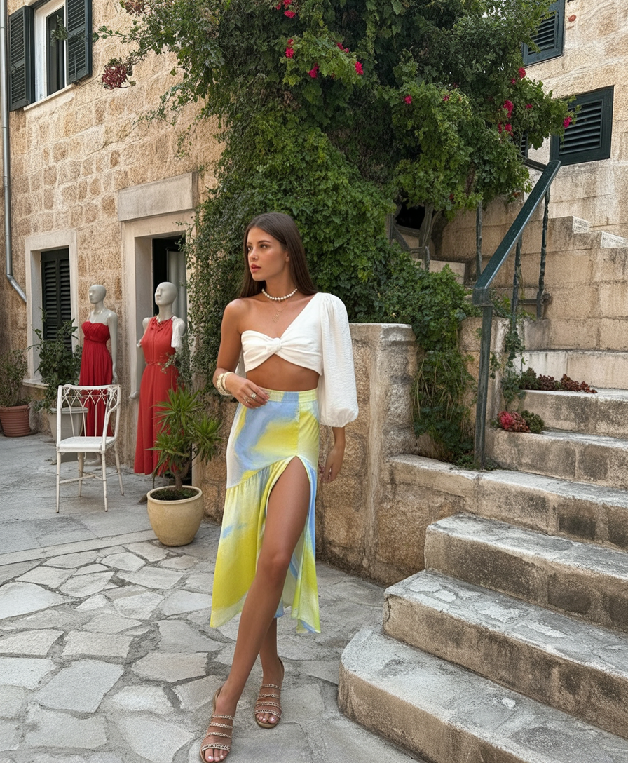 Out of all the outfits, this is undoubtedly the most classy. The top is sculpted and is one-shouldered, while the flowing skirt with a slit adds softness and drama. It gives the impression of an elevated spring break aesthetic and is an ideal outfit for warm evenings, charming streets, and those once-in-a-lifetime moments.