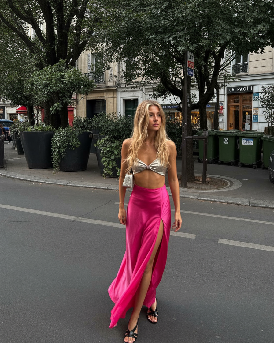 This outfit is bold, confident, and unapologetically eye-catching. The metallic top adds shine, while the hot pink skirt brings drama and movement. It feels like a statement look you’d wear when you want to be remembered—powerful, feminine, and a little daring.