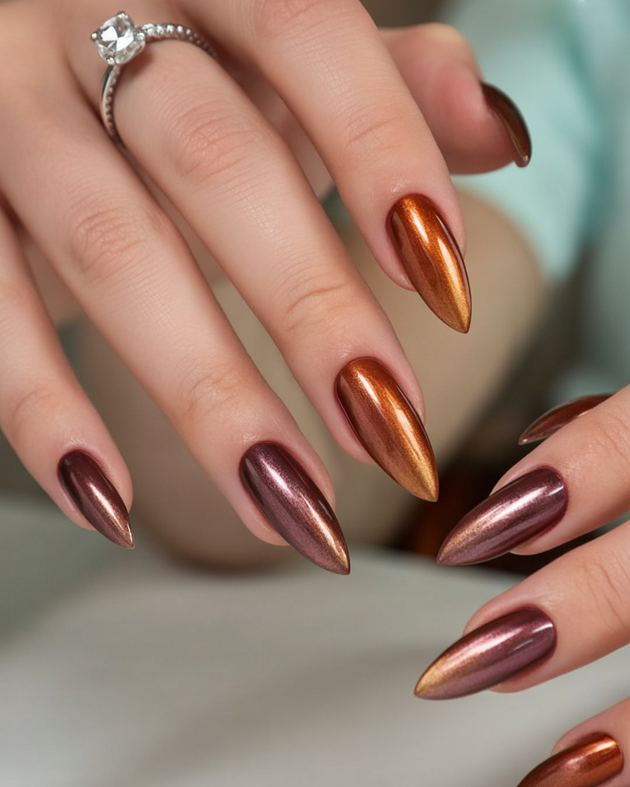 Warm, metallic, and bold—these brown and copper cat eye nails radiate confidence and strength. The glossy polish shifts between rich red-brown and fiery bronze tones, giving each movement a sense of depth and magnetism. This look feels powerful yet feminine, perfect for when you want your manicure to speak before you do.