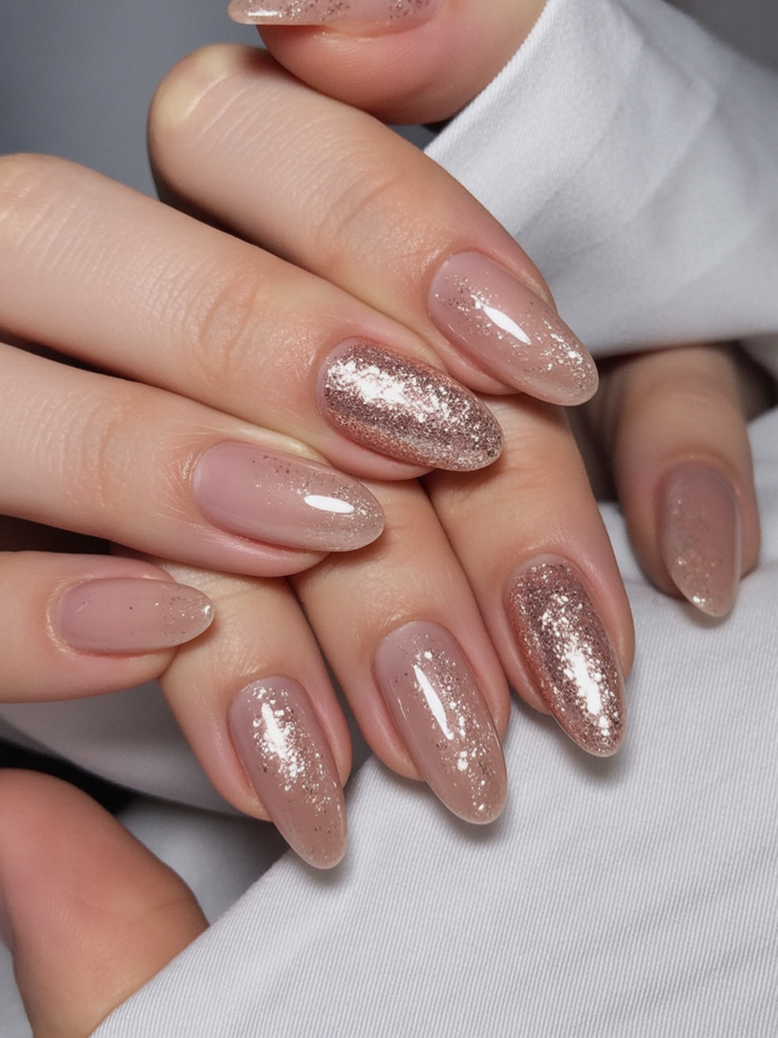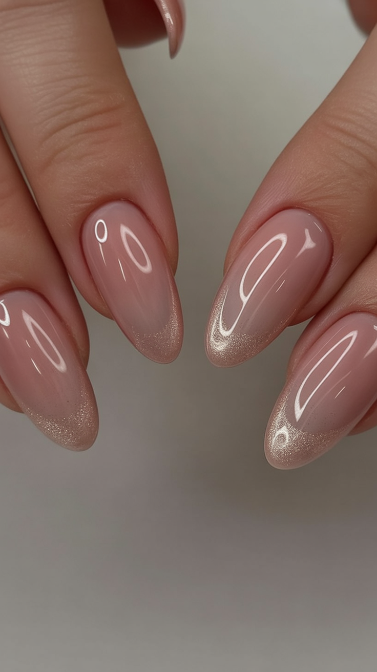 Ideal for medium to long nail lengths, this design flatters anyone who gravitates toward neutral tones but still wants a hint of sparkle. It’s especially striking when paired with gold rings or a soft beige outfit. To maintain that high-shine finish, apply a thin layer of top coat every few days for a long-lasting glow.
