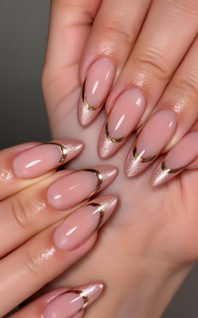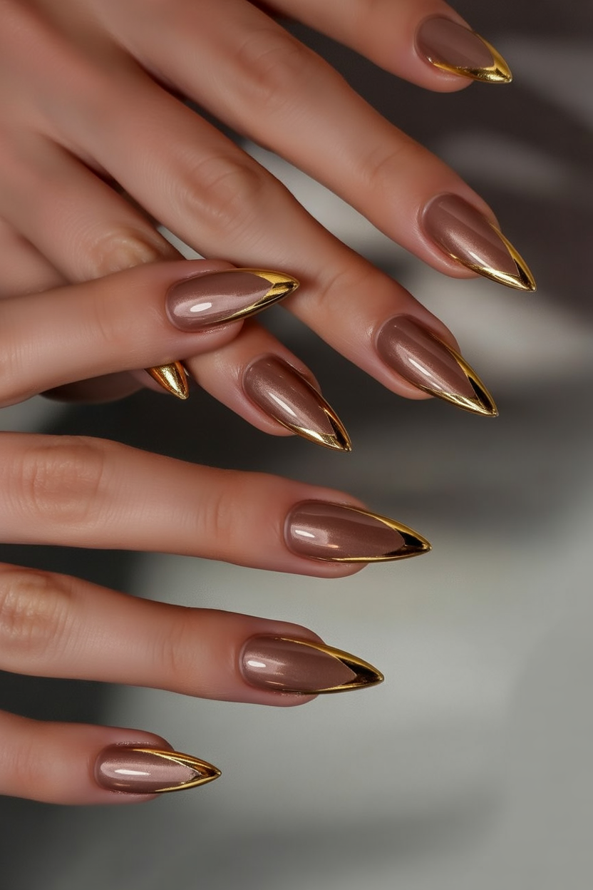 Best suited for those who adore neutral shades but still crave a bit of drama, this design complements short or long nails equally well. The reflective gold edges draw attention to the nail’s shape, creating an effortless French-inspired twist. Pair it with gold accessories or a chocolate-toned sweater for a cohesive, polished look that transitions seamlessly from office chic to evening glamour.