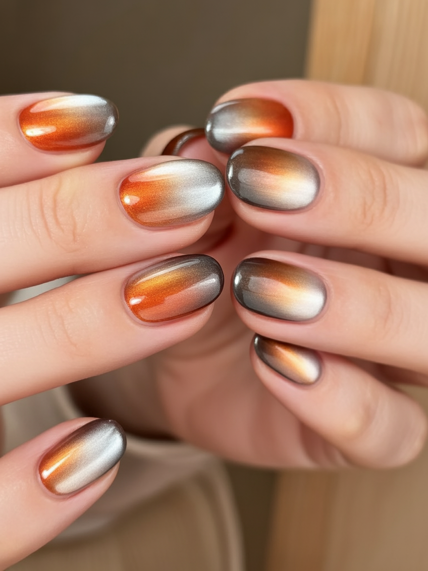 Perfect for anyone with a creative streak, this look thrives on short, rounded nails that show off the color transitions best. It flatters warm skin tones and adds a pop of modern art to any outfit. The silver and copper combination also makes it a versatile choice for fall or holiday seasons, blending beautifully with both casual denim and sleek evening wear.