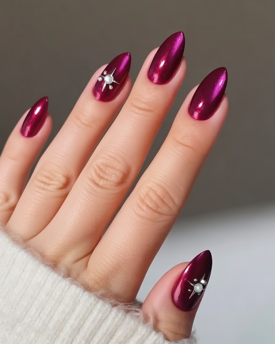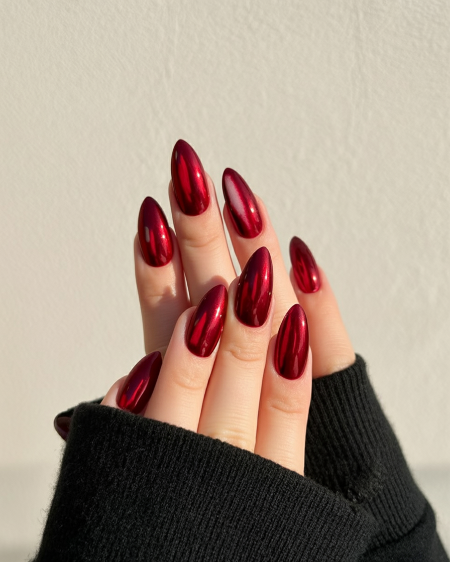 Best for medium to long almond nails, this look flatters cooler skin tones and pairs beautifully with gold or silver accessories. The dark red undertones make it a classic for winter, yet its polished finish means it works year-round. Add a touch of red lipstick, and you’ve got a timeless combination that never fails to impress.