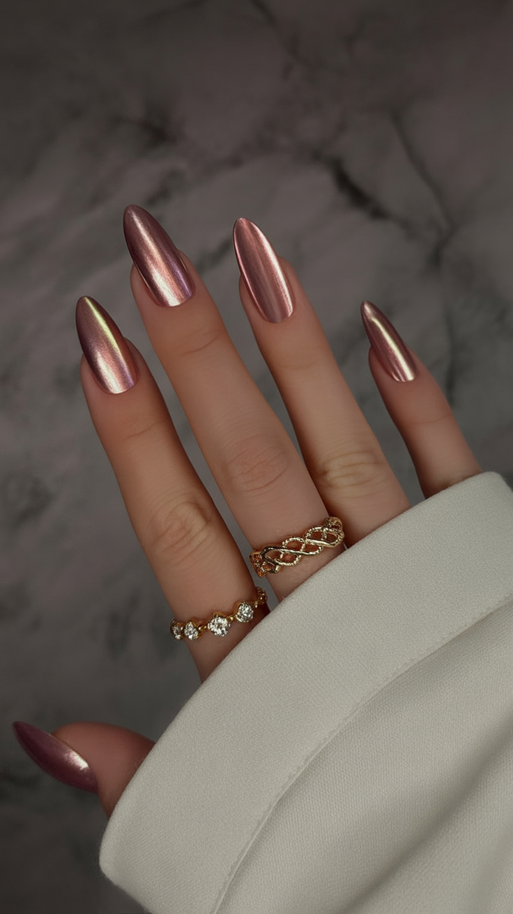 Warm, luminous, and endlessly chic—this rose gold cat eye manicure is the definition of soft glamour. The mirror-like sheen gives your nails a radiant, polished look that feels both sophisticated and modern. It’s that perfect blend of metallic pink and gold that looks expensive in the best possible way.