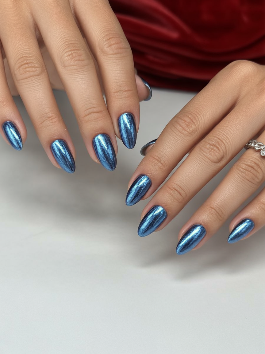 Bold and mesmerizing, this blue cat-eye manicure feels like wearing a piece of the night sky. The metallic polish shimmers with depth and mystery, giving off an ultra-modern vibe that commands attention. It’s perfect for days when you want your nails to do the talking.