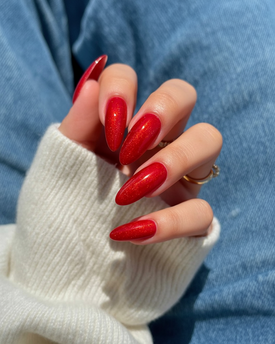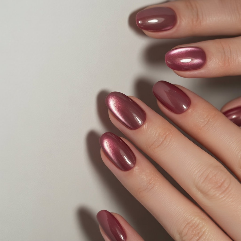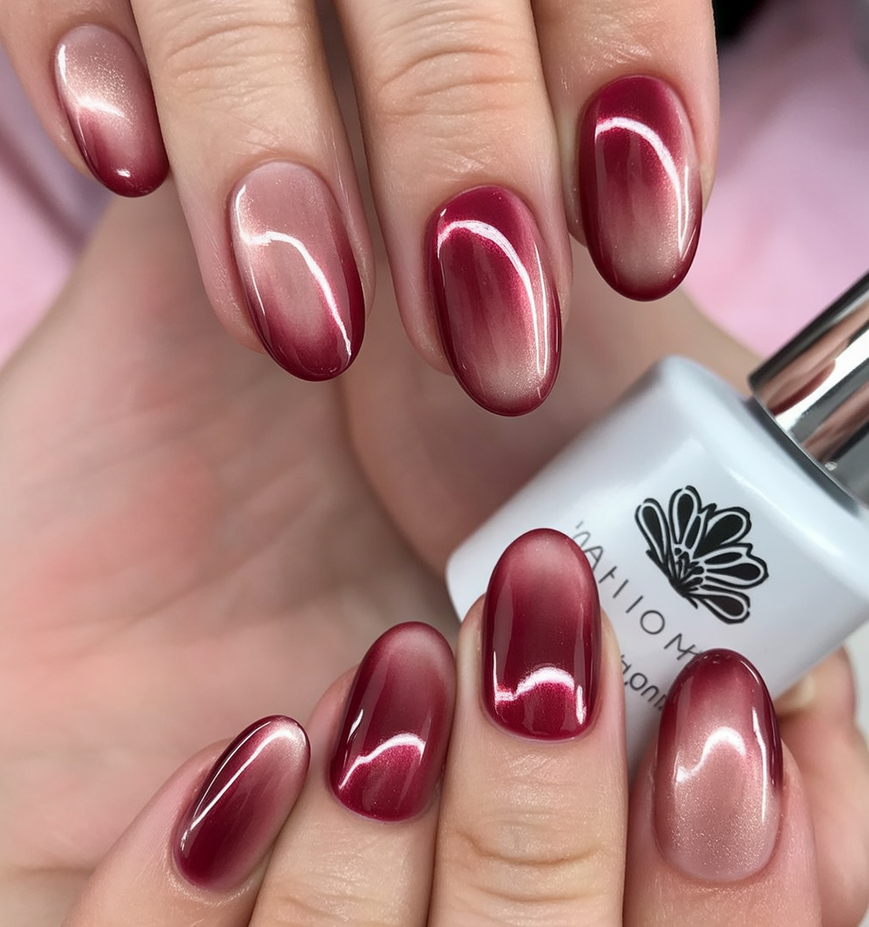 This cherry red cat-eye manicure brings instant warmth and confidence. The shimmer dances under sunlight, creating a fiery yet elegant glow that feels festive and timeless. It’s a color that makes your hands look refined and powerful at once—a red that never goes unnoticed.