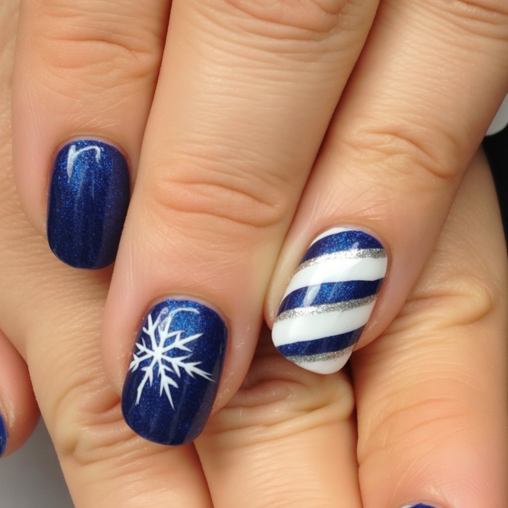 That style is wonderful for short nails-the dark base elongates the fingers while the bright, crisp white snowflakes keep things vibrant. The stripes on the accent nails are very much in line with an easy DIY inspiration, and they go ridiculously well with some chunky knit sweaters or silver jewelry. It’s a Christmas nail design that feels seasonal but still a bit understated in terms of silvery glitter taste.