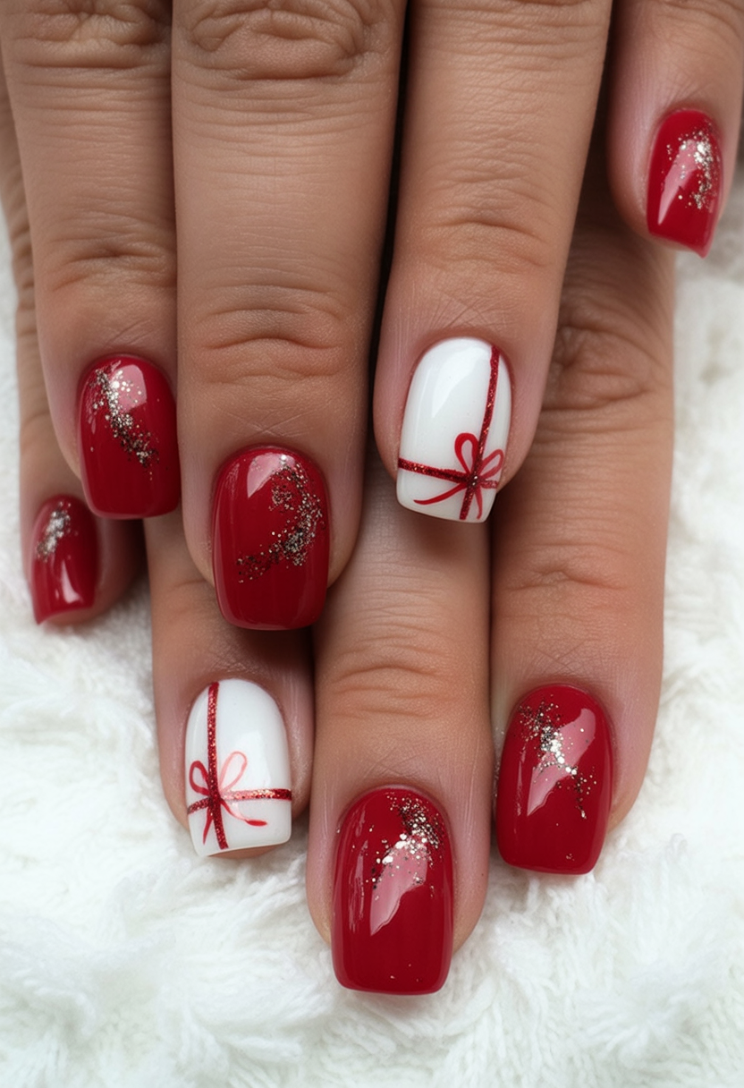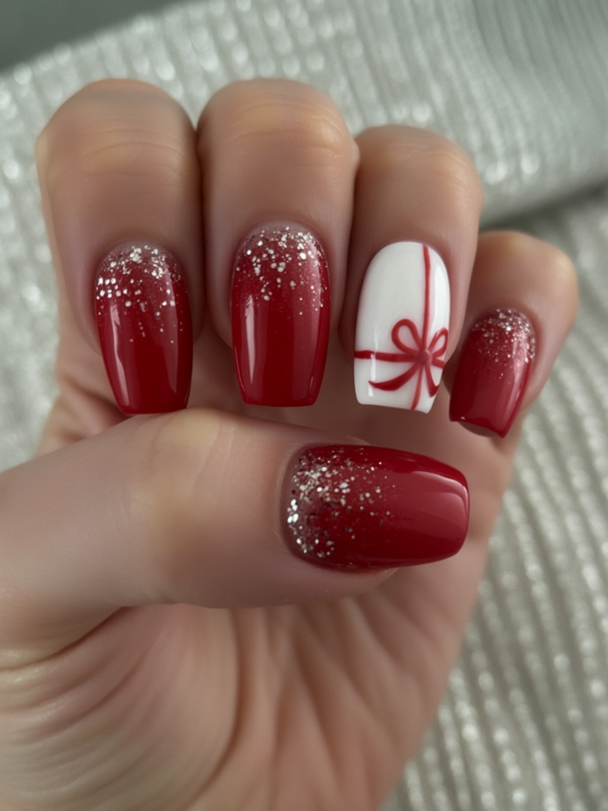 This manicure speaks to the charms of presents being unwrapped under the Christmas tree. A glossy red base with snowy glitter tips feels warm and festive, while the white accent nail with a neat bow adds a playful gift-wrapped surprise. It’s polished yet whimsical, like holiday joy fully articulated on your fingertips.