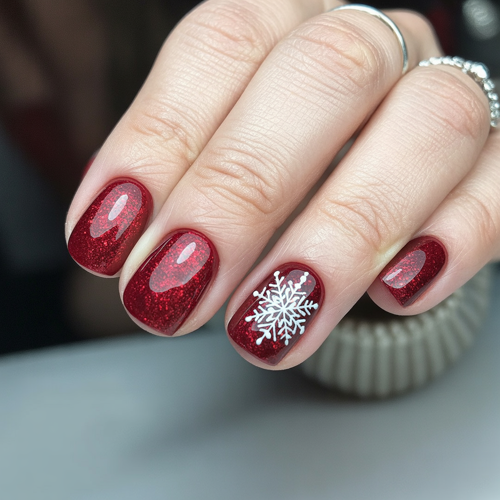Nothing feels more classic than rich red glitter-tipped nails for December, an added crisp white snowflake making this manicure pure holiday magic. It’s festive, flattering, and sparkles under the light like fresh snow on Christmas Eve-a design that’s simple and striking at once.
