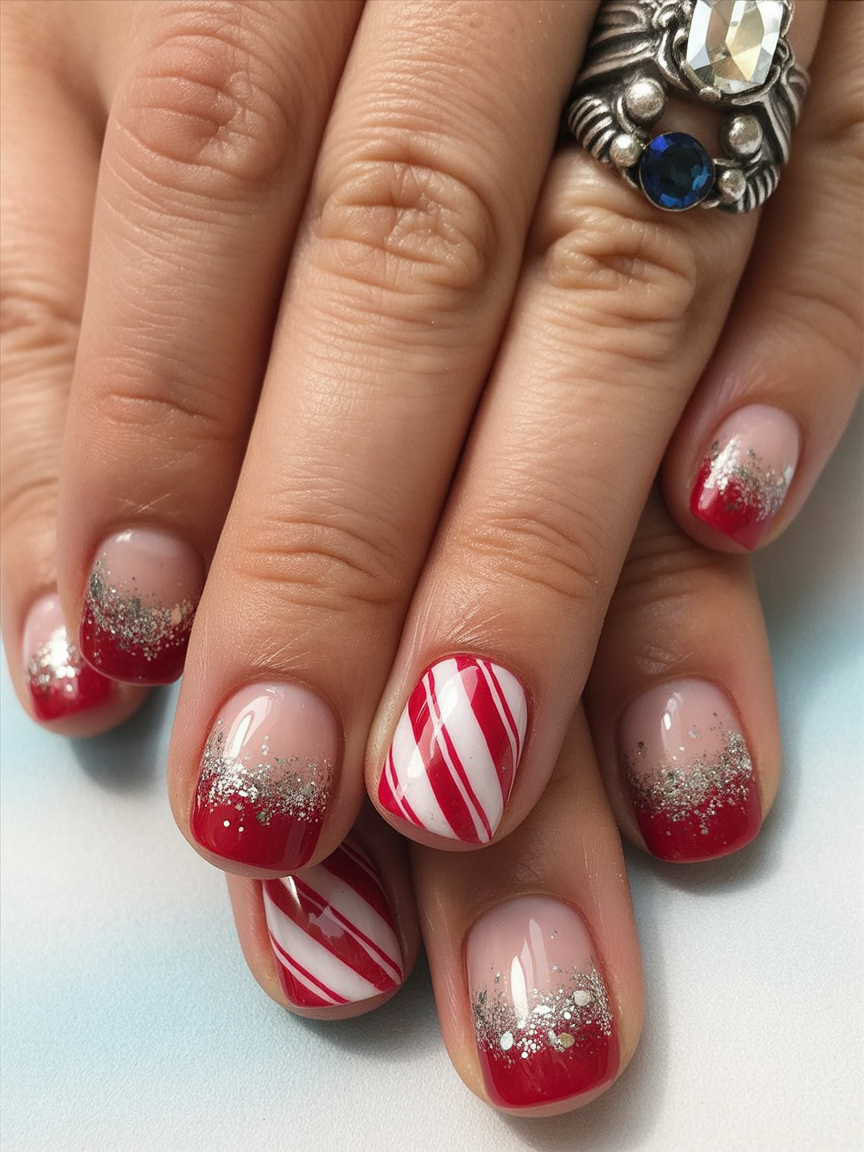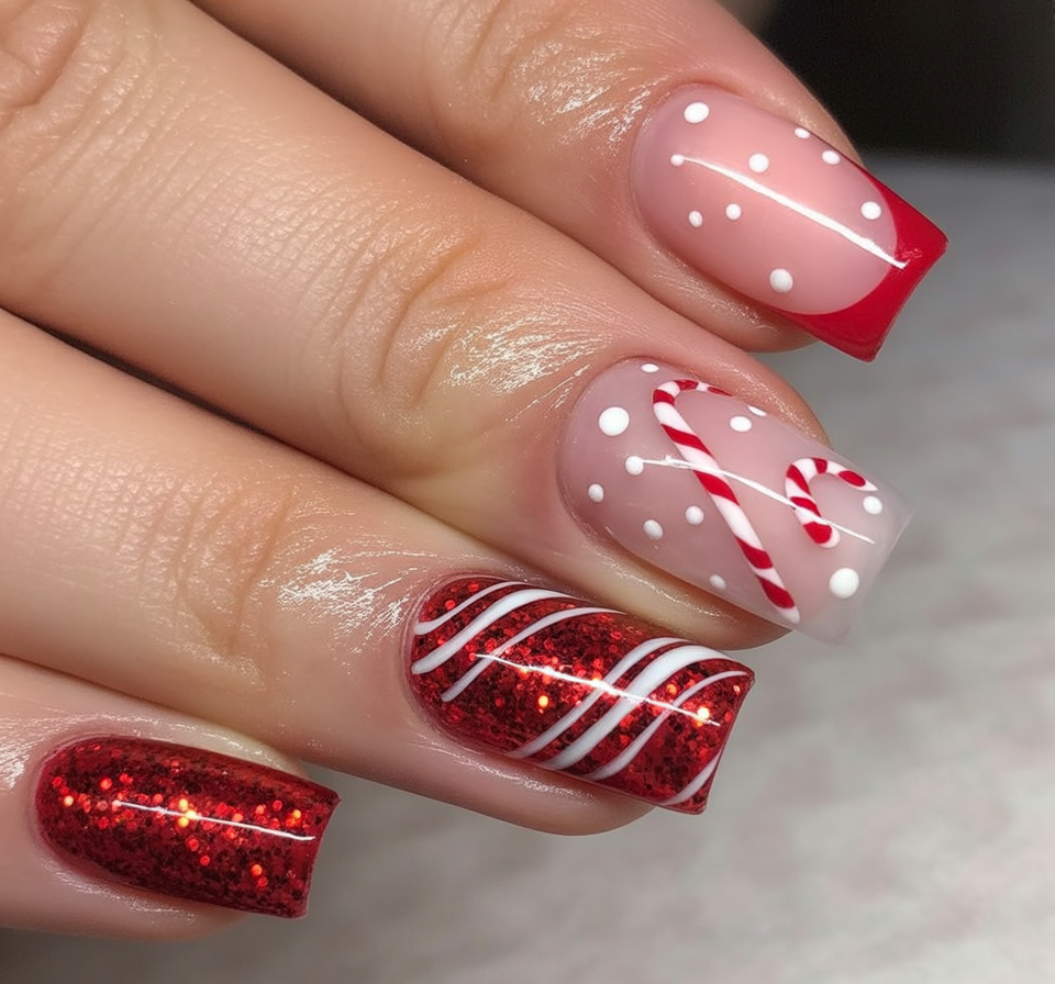 This manicure takes candy cane vibes to a whole new level. Red glitter, white stripes, and playful candy accents give your nails a sweet, festive touch. The look feels cozy and nostalgic, like sipping hot cocoa while unwrapping peppermint treats.