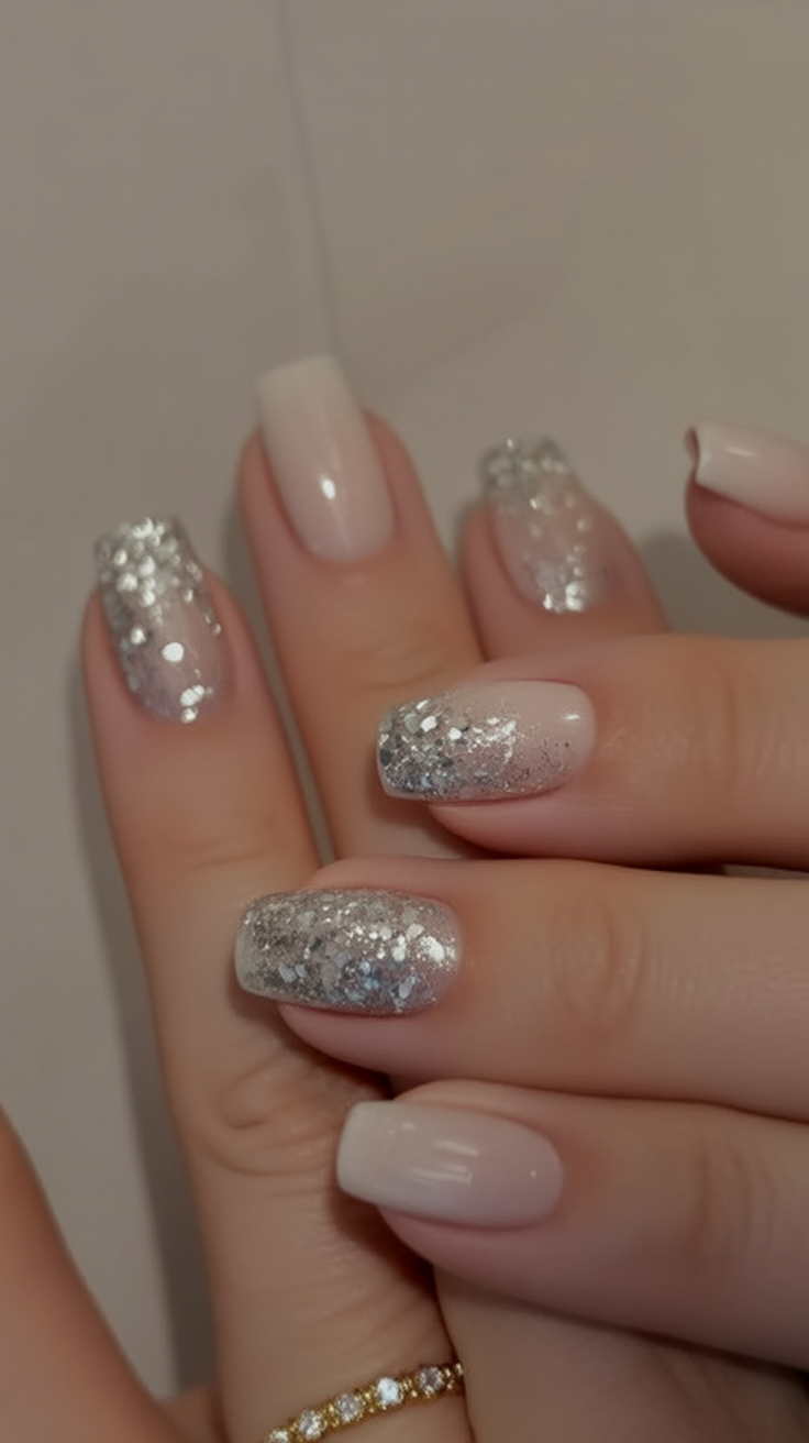 This design works beautifully on long square nails, as the gradient fade elongates the fingers. It’s also versatile enough to wear beyond December—think New Year’s Eve or even winter weddings. If you’re drawn to winter silver glitter that feels both chic and easy, this one is a perfect pick.