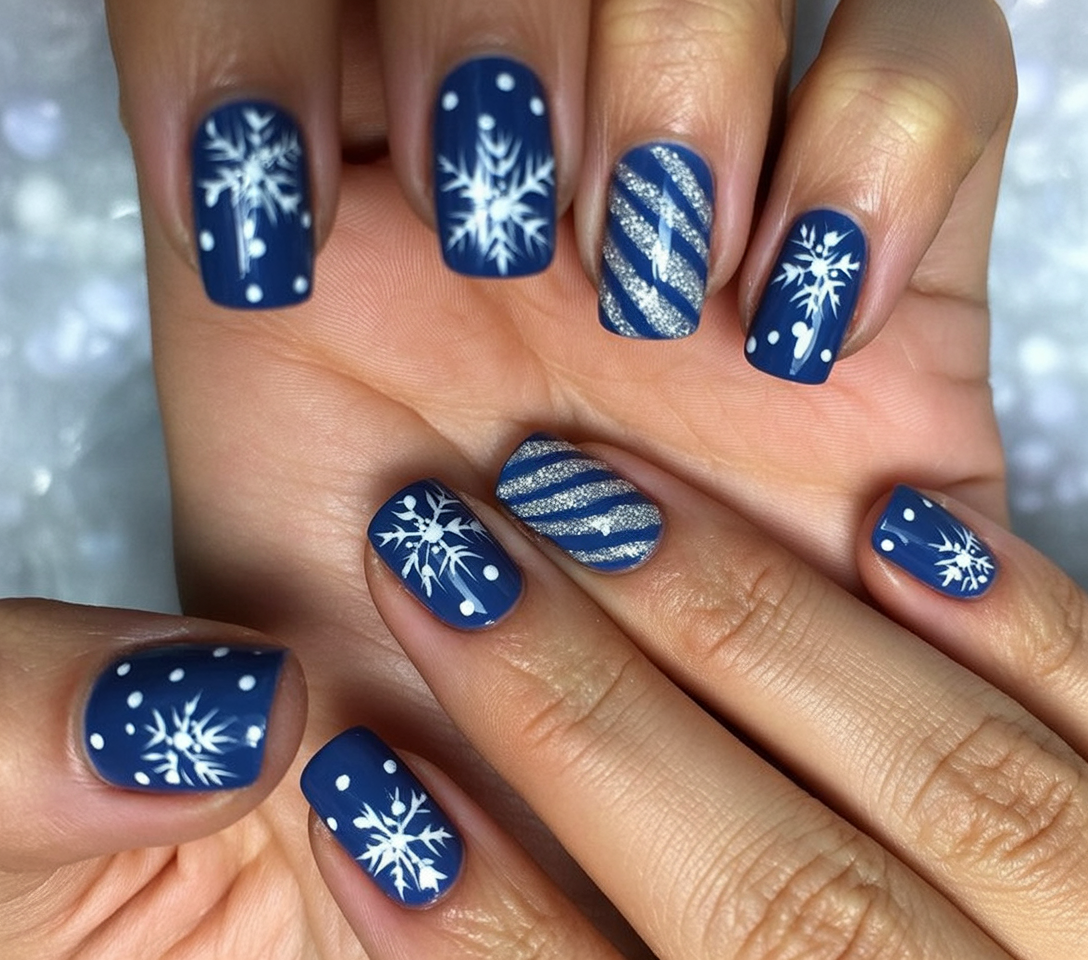 This manicure feels like stepping into a snowy winter wonderland. The matte blue base gives a cool, modern twist, while bold white snowflakes and playful dots add that festive sparkle. Silver stripes on accent nails bring in just the right amount of Xmas sparkle to keep the whole design fresh and eye-catching.