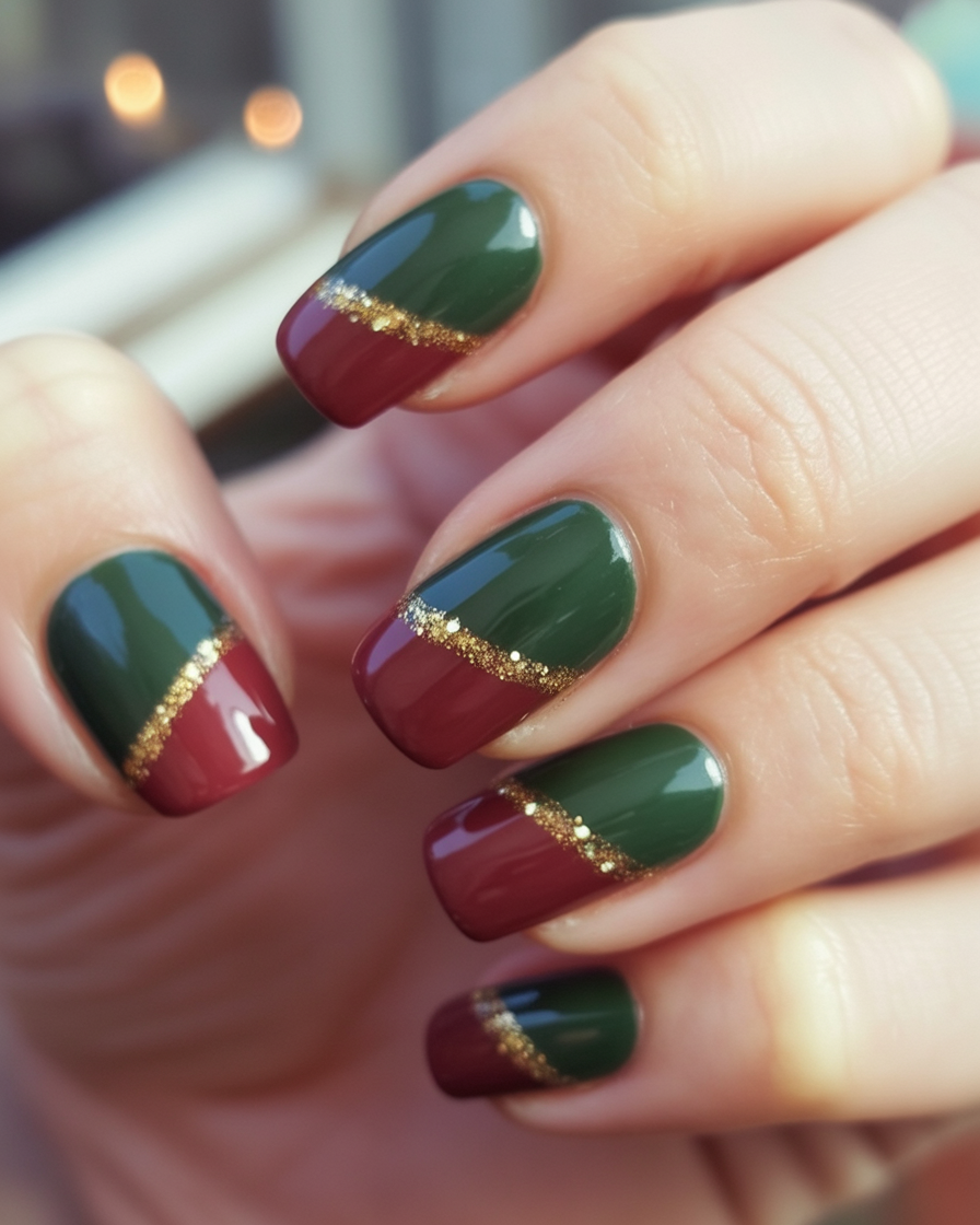 Green and burgundy are classic Christmas shades, but when paired with a gold stripe accent, they become effortlessly modern. This manicure feels chic and timeless, like a nod to holiday tradition with a fashionable 2025 update. It’s the kind of look that works as well at the office as it does at a holiday party.