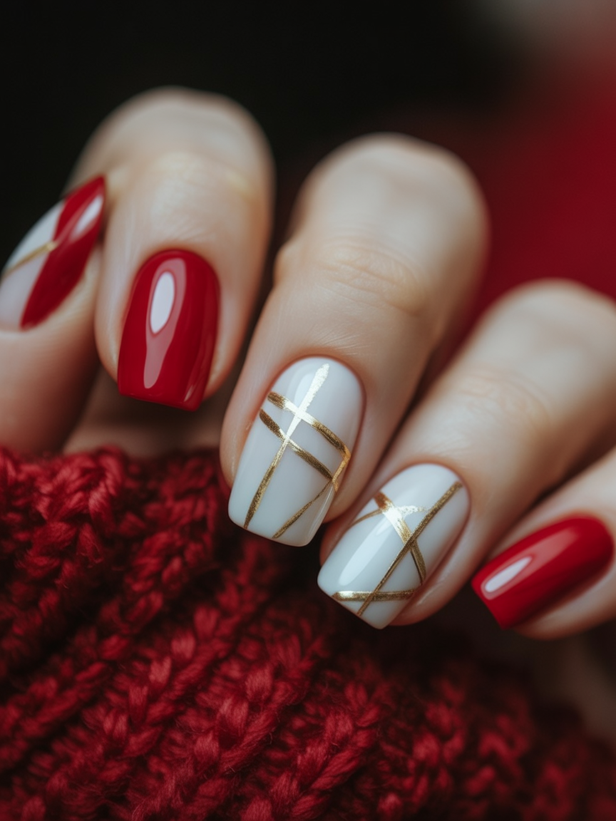 Elegant and sophisticated, this manicure mixes glossy red with crisp white and gold ribbon accents. It feels like unwrapping a luxury gift, blending minimalism with festive glam. The gold striping tape details elevate the look into something refined yet festive.