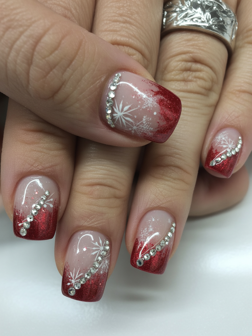 This is the perfect design if you live for glitz. Red glitter ombré nails with rhinestones and fine snowflakes constitute quite a show-stopping design. This one is festive, bold, and for someone who wants their nails to grab all the attention.