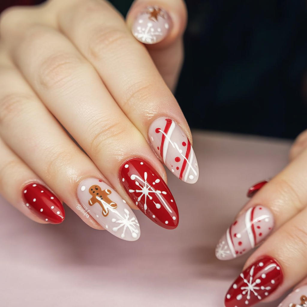 Whimsical, playful, and full of personality, this design is a pure reflection of Christmas spirit. With a gingerbread man, candy cane stripes, and snowflakes with a sprinkle or two, it’s like sporting a delightful Christmas storybook on your fingertips! It’s light-hearted and sure to spark smiles-the perfect conversation starter at family gatherings.