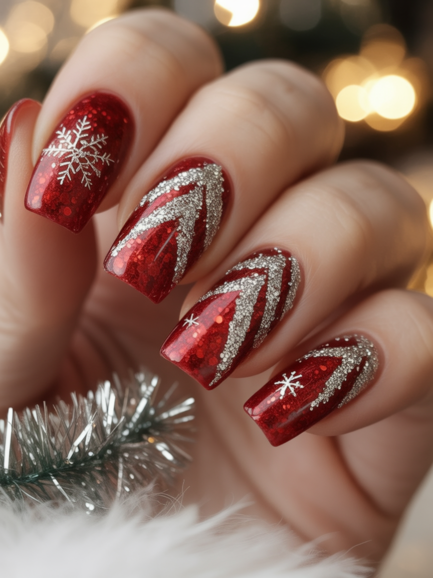 Like snow sparkling under moonlight, this manicure uses a soft nude base topped with dazzling silver glitter. It’s a sophisticated way to celebrate the season, offering shine without being overly busy. The result is elegant, glamorous, and timeless.