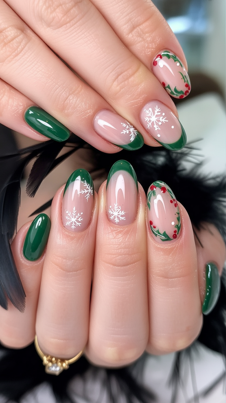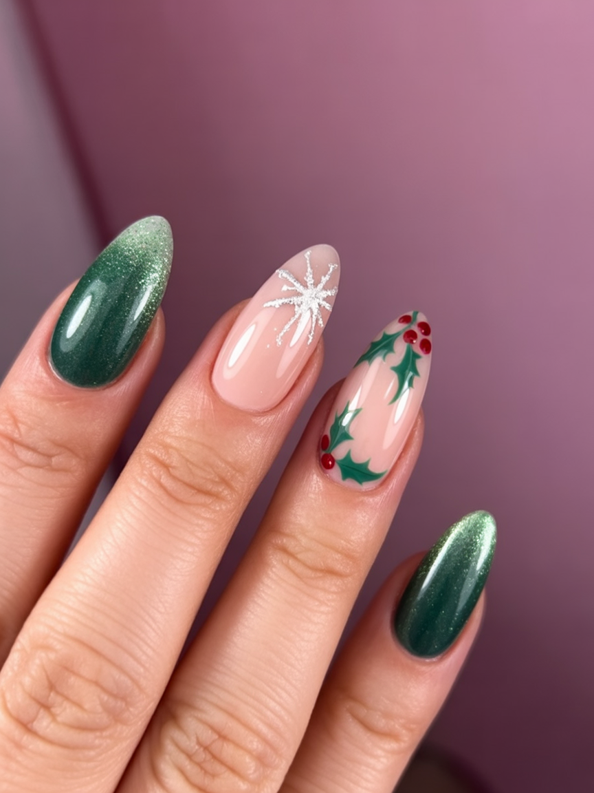 Such a gorgeous look for almond and stilleto nails, for I suppose an elongated shape provides more room for intricate holly art. Green is in HUGE 2025 trend, especially for Christmas nails, so this one keeps you right there in fashion. The design is flexible enough to attend all kinds of holidays, even a New Year’s celebration.