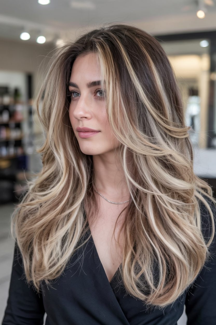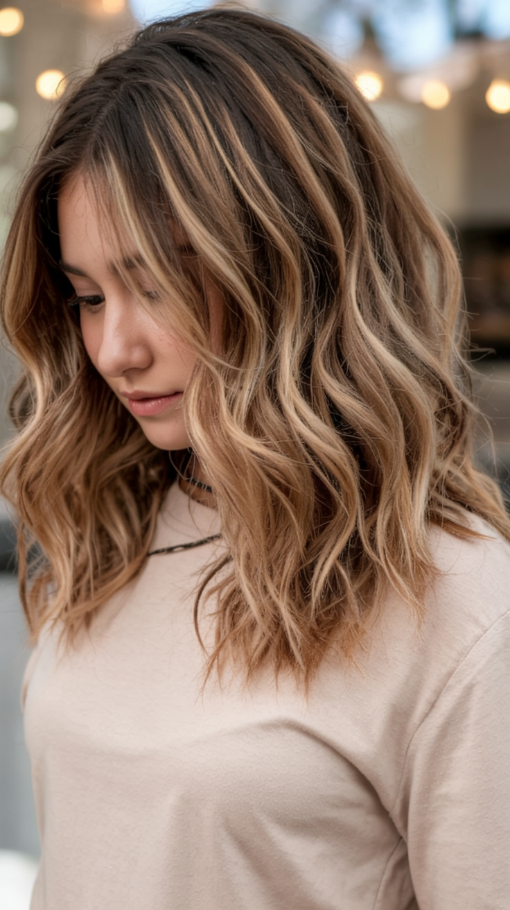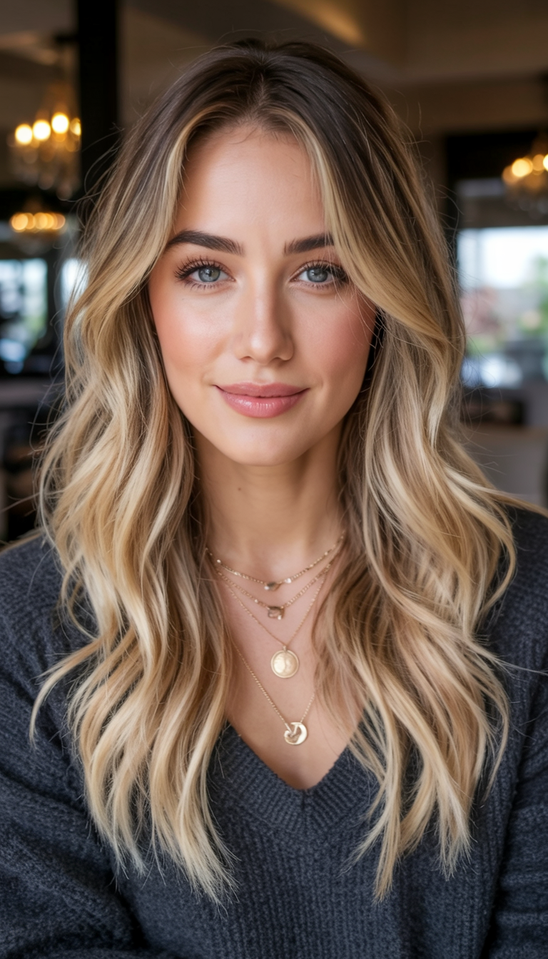 Great for women with long layers and thick wavy hair, this balayage blends dimension with softness. It’s ultra-flattering for warmer skin tones and requires minimal upkeep thanks to the shadowed dark roots. Just a little dry shampoo and soft curls, and you’re set for days.