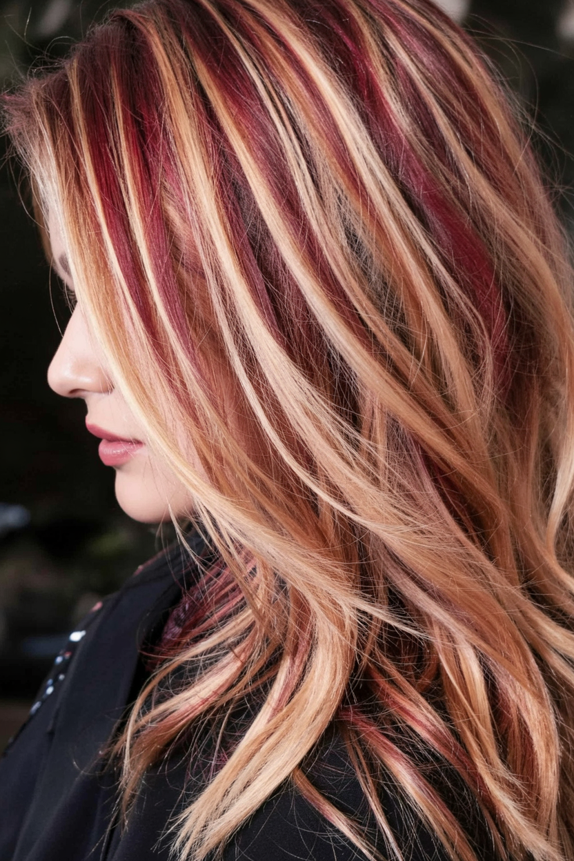 Ready to shake things up? This bold mix of rich raspberry and blonde feels daring yet wearable — think of it as low lights caramel with a punk twist. It’s eye-catching, confident, and totally custom.