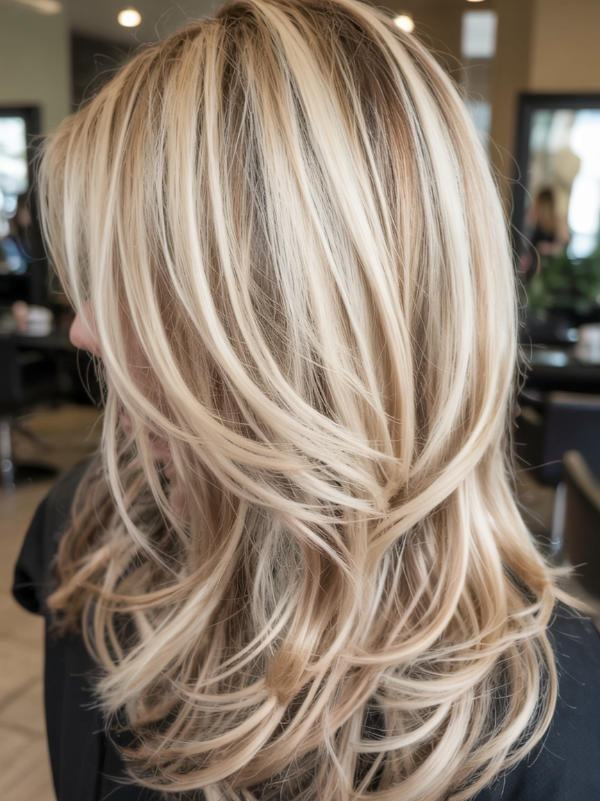 This is that haircut that turns heads as you walk by — all those bouncy layers catching the light and floating with every step. The warm blonde shade mixed with low lights highlights creates incredible dimension, making the hair appear fuller and more voluminous. It’s timeless, yet totally fresh.