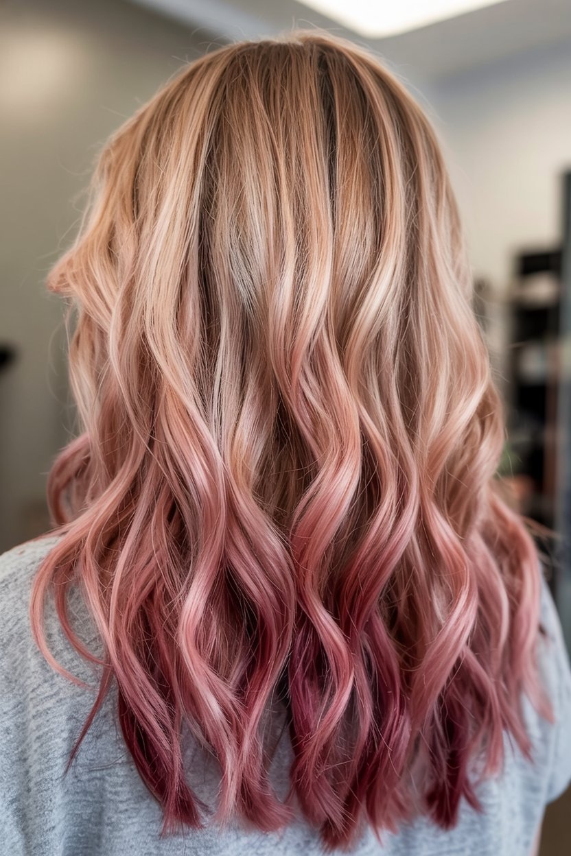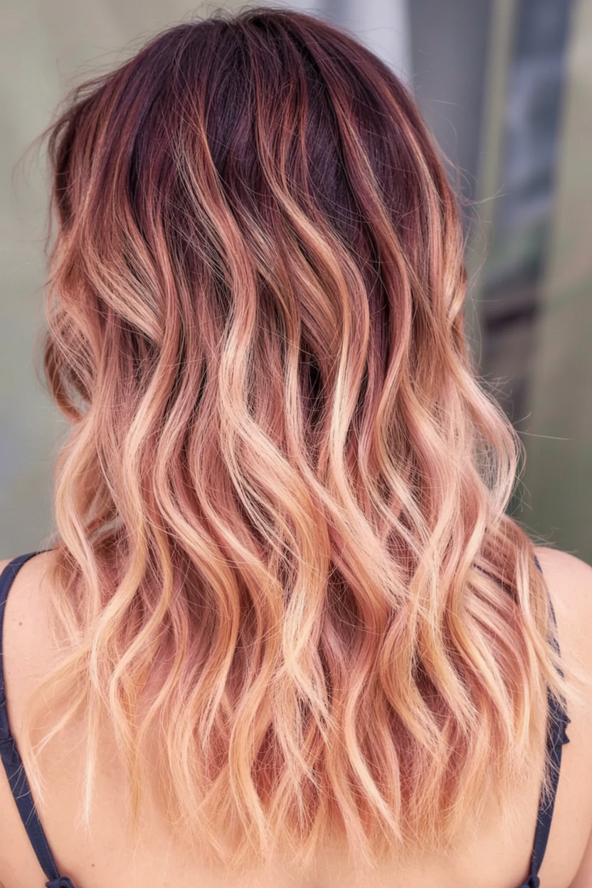 There’s something cozy and decadent about this look — like cinnamon lattes and cozy scarves. The rooty berry tones fade into soft caramel and pink ends, creating a luscious gradient that’s pure fall magic. It’s playful without being loud and pairs perfectly with chunky knits and leather jackets.
