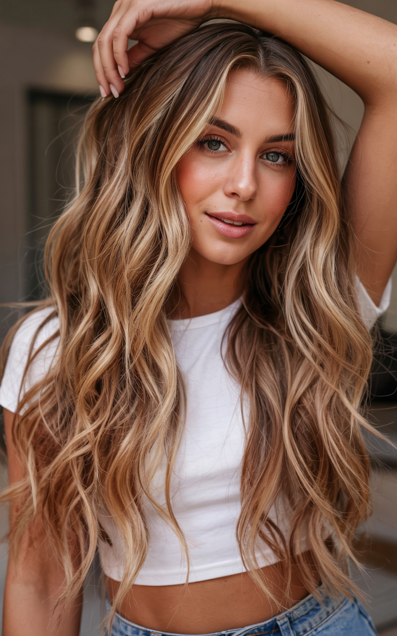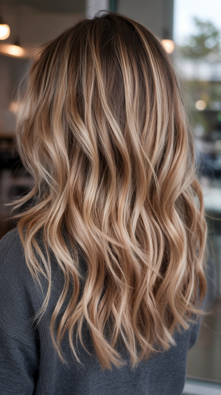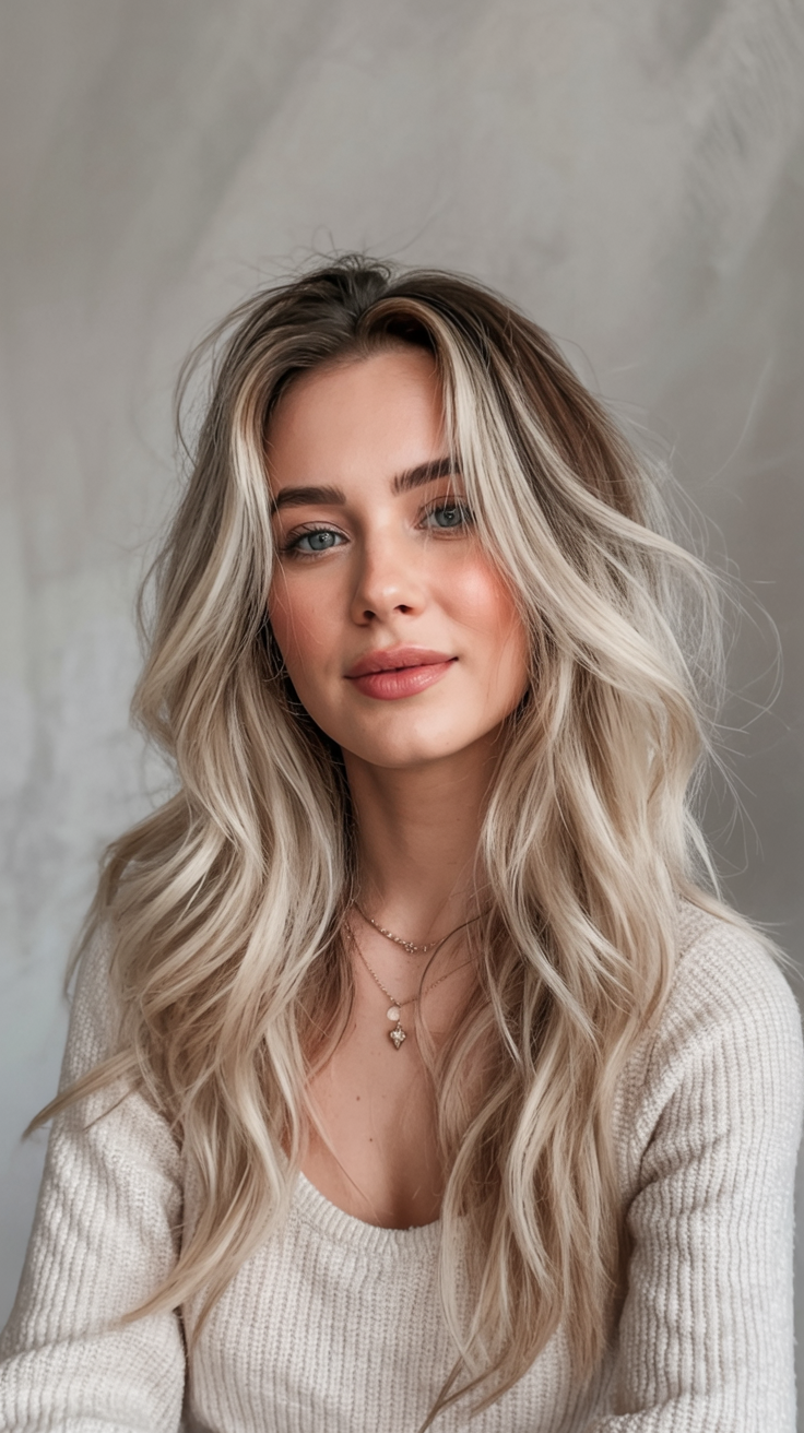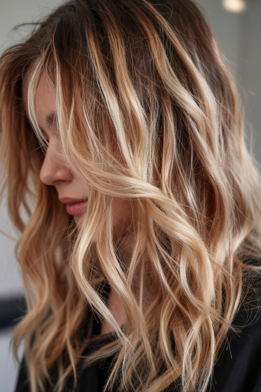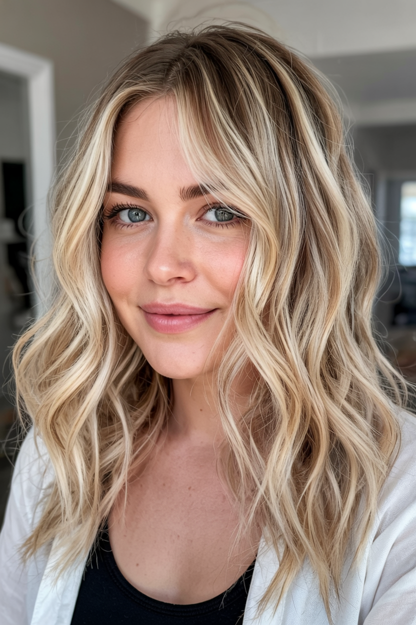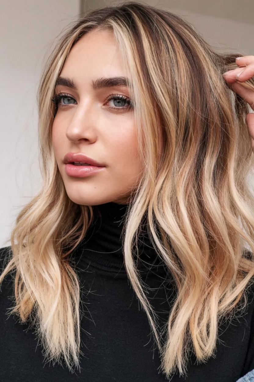 A great choice for naturally dark roots who want that sunlit blonde payoff without constant touch-ups. It works best on medium length hair with subtle waves or loose curls. Use a volumizing mousse at the roots and blow dry with a diffuser to get that lifted, lived-in fullness.