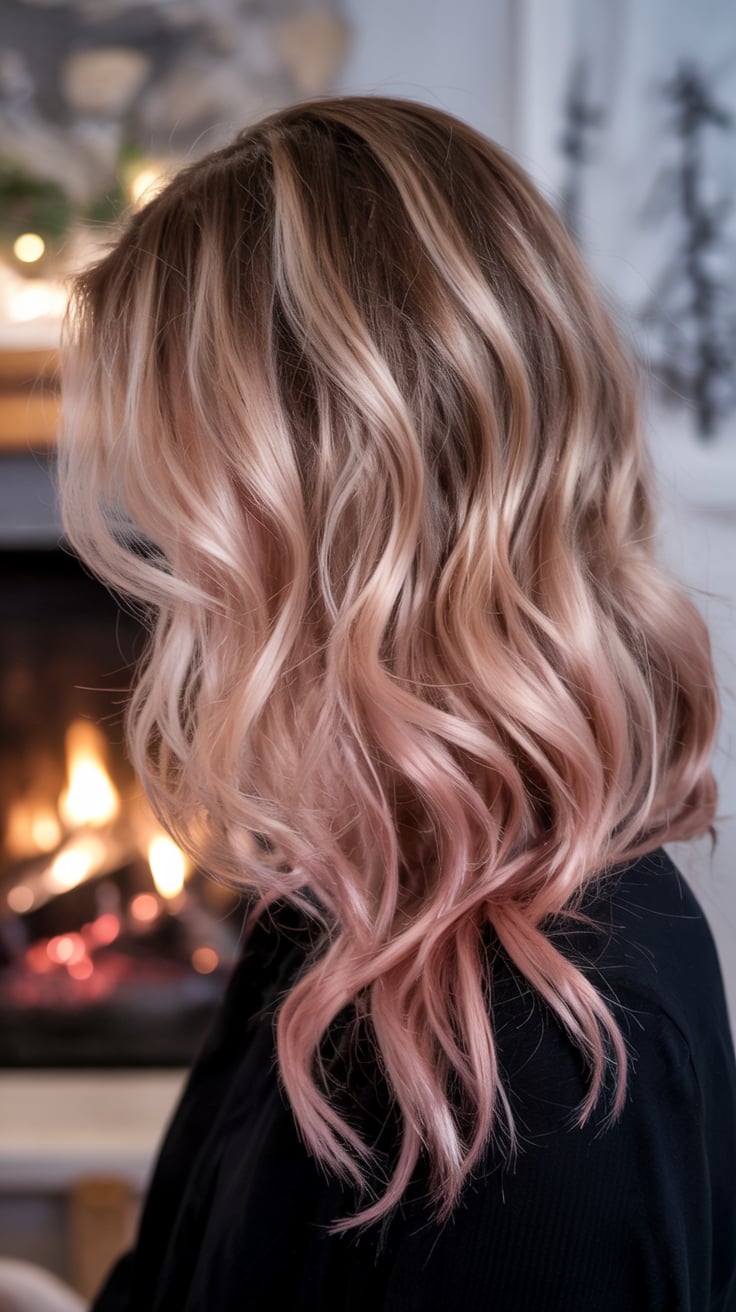 Like a cup of mulled wine by the fire, this frosted caramel balayage ombre with blush-pink tips is a warm embrace for your hair. The transition from neutral blonde to soft rose makes it feel feminine and cozy without being overly sweet.