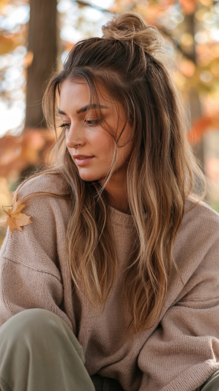 There’s something effortlessly romantic about this half-up style — like cozying up with a novel under golden leaves. The warm caramel tones melt into deeper roots, giving it that dreamy, sun-kissed glow even on cooler days. It’s the perfect balance of undone and intentional.