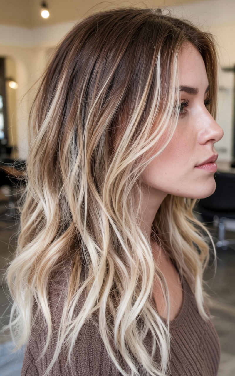 Edgy meets elegant in this striking contrast look. The deep dark roots melt into platinum ends, with a vivid money piece framing the face — it’s confident, modern, and just a little rebellious. There’s a “don’t mess with me” vibe wrapped in soft, beachy waves that keeps it perfectly balanced.