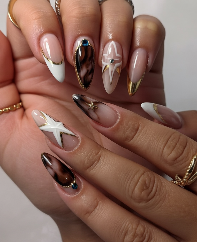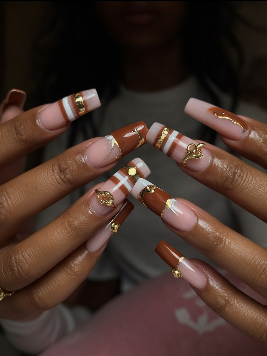 These nails are just a combination of classy and bold—like a latte with a sprinkle of gold flakes on top. The combination of creamy nude and deep caramel hues feels warm yet pricey, with white stripes giving it a sleek, geometric edge. Each gold detail looks hand-set with precision, exuding that designer-level factor without putting in too much effort. It’s a set that exclaims, “I’m stylish, and I know it.”