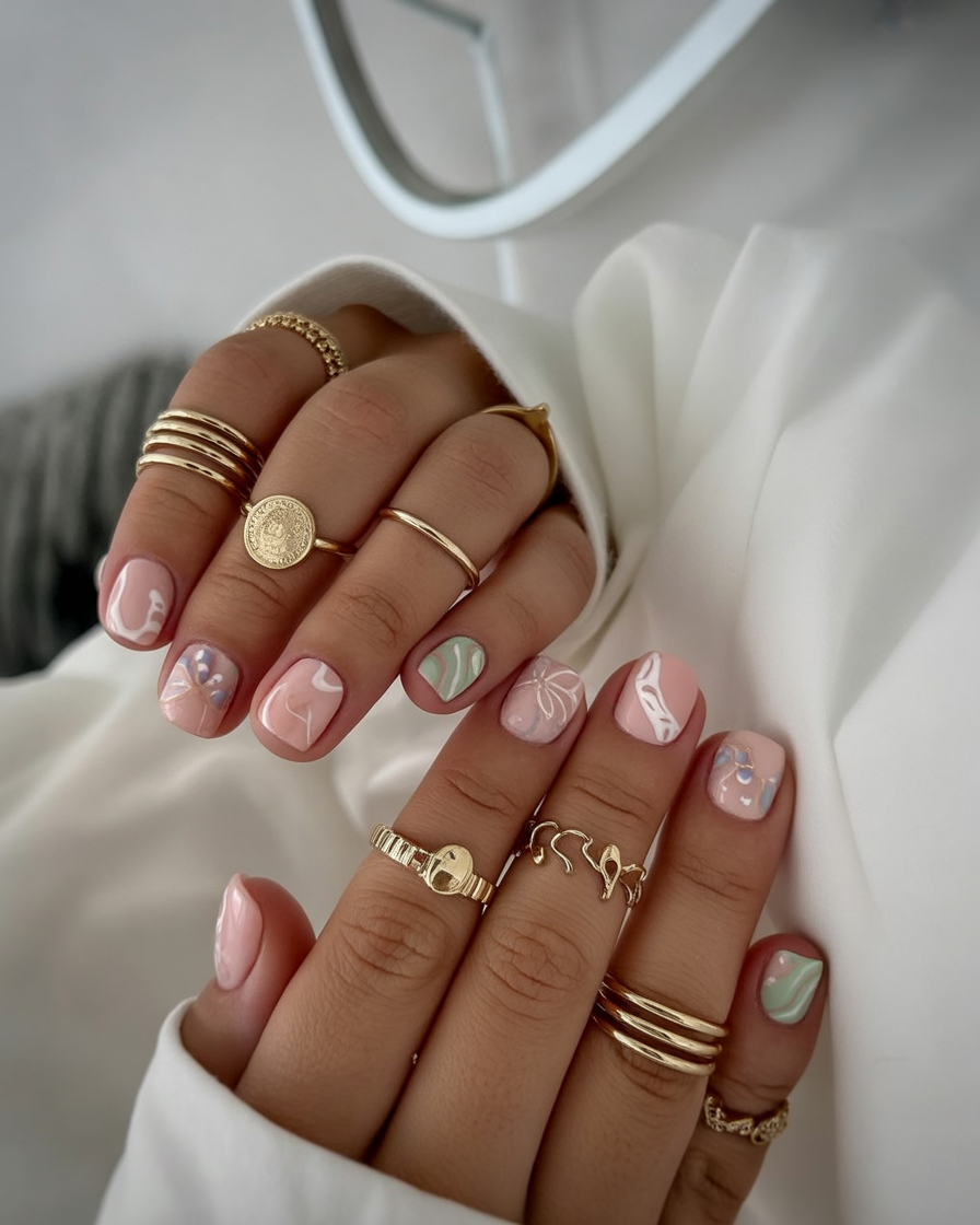 Ideal for short nails or for a person who wants a minimalist yet powerful look, this style suits any nail shape. It’s minimal maintenance but attention-grabbing—no need for a weekly trip to the salon. Such adorable pastel shades look great for summer or a birthday party. Team them with a nude pink lip or minimal gold accessories to keep it about the design.
