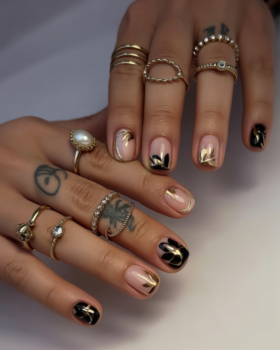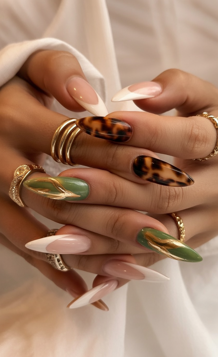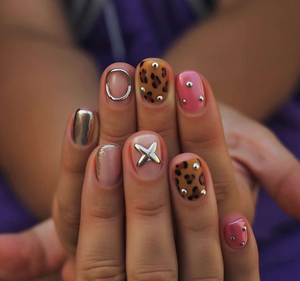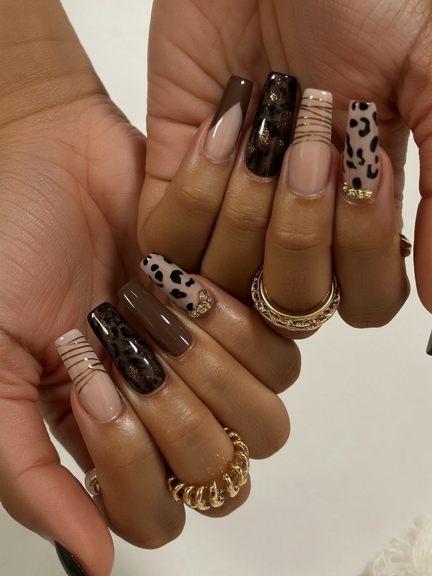 These nails exude confidence—literally. The combination of leopard print, nude, and high-gloss black patterns exudes “so determined” with a dash of luxury. The gold accents bring it all together, making it feel high-end and on-trend. It’s the sort of mani you wear if you want to get that feeling of being unstoppable—sleek, wild, and effortlessly together.