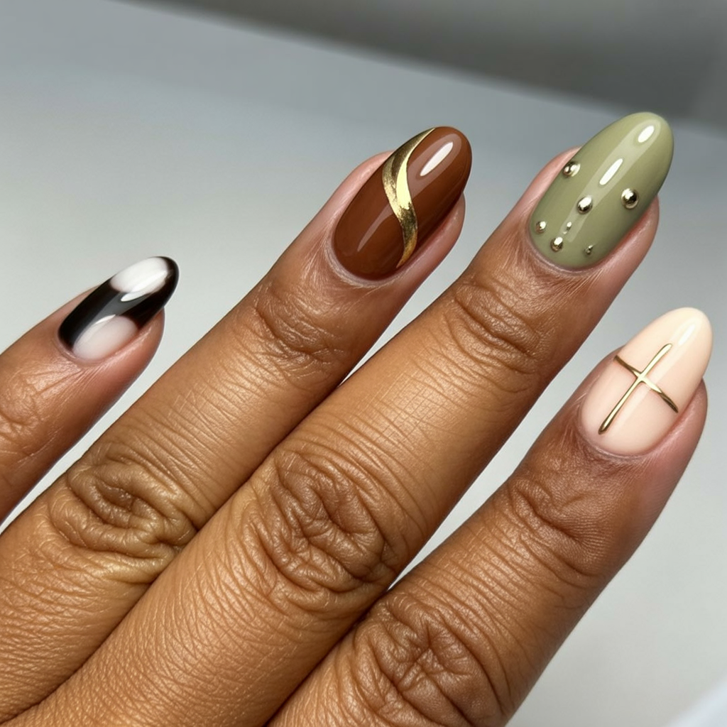 These nails are a work of art on your fingertips—earthy, sophisticated, and with lots of individuality. Meticulously combining caramel brown, sage green, and creamy beige with minute gold accents, this look feels distinctly modern. Luxuriously understated, this look suits women who prefer to look effortlessly sleek but unquestionably stylish with no need to raise a belt or passport over it.