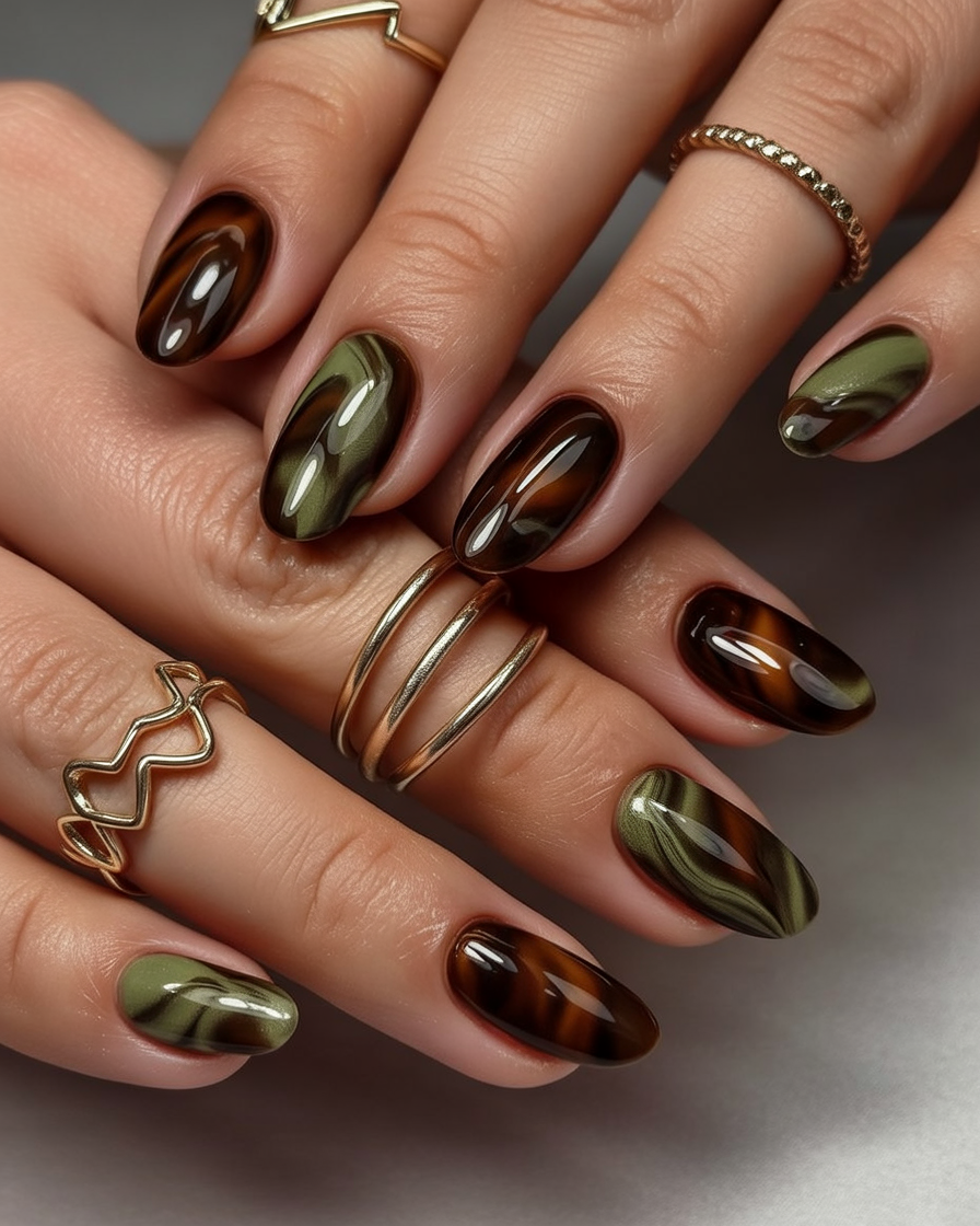 Shimmery, mesmerizing, and seemingly sophisticated—such nails are like looking at polished marble stone. A combination of olive and dark brown hues with a velvety reflective sheen makes it both raw and earthy and high-tech. They look luxurious but not ostentatious, exuding that “cool girl who’s in the know about this season’s trends” vibe.