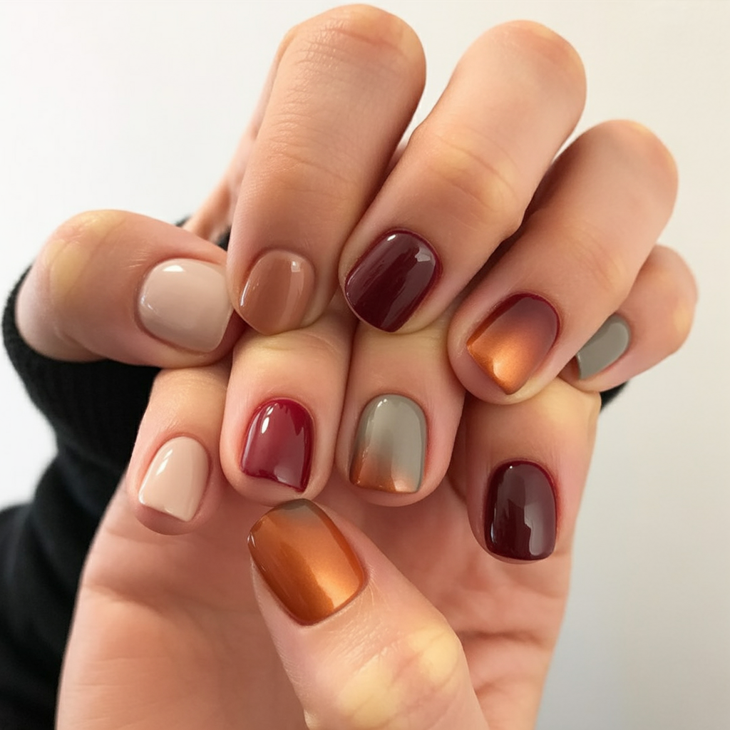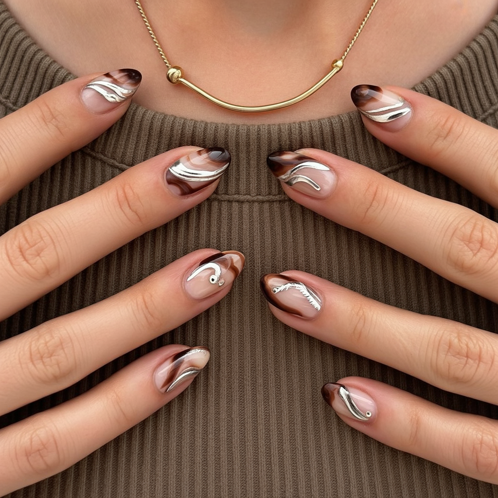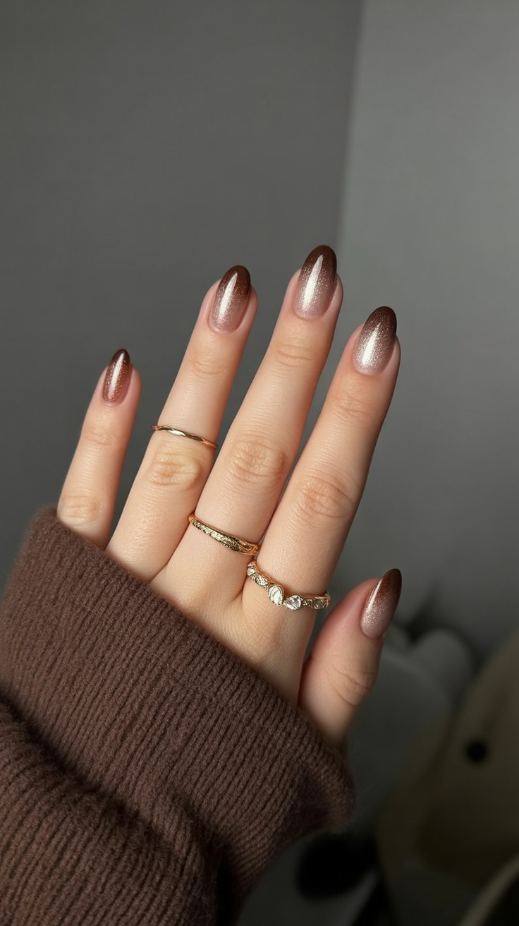 There’s a certain strength to subtlety—and it shines in these metallic ombre nails. The gradient of soft nude to lustrous brown comes across as comforting, like autumn leaves bathed in a latte’s warm glow. It’s refined luxury that neither screams for attention nor fails to impress with its subtle sophistication. Ideal for medium-length nails, this look suits everyone who favors sophisticated over ostentatious. It gets its dimension with a metallic sheen that reflects light wonderfully on a chilly fall afternoon. It suits warm skin tones best and goes hand-in-hand with neutral sweaters, gold pieces, and that coffee-run-press-shot look we’re all guilty about secretly adoring.