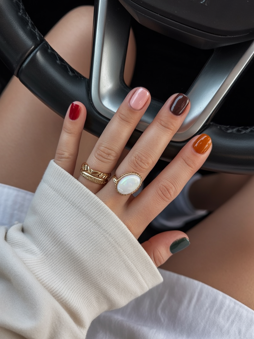 Sometimes your best fashion moments are a result of fun spontaneity—like this adorable combination of hues that just happens to work. Chocolate, mustard, green, pink, and red tones create a festive color scheme that’s as comforting as a road trip playlist during autumn. It’s fun, free, and just perfectly surprising—like your go-to sweater in nail color. Ideal for medium-length nails, this cute look is a must-try for change-it-ups who still crave a harmonious look in their manicure. Whichever color you choose, they both look lovely with each other, making it a great choice for weekend days or artistic workplaces. Best of all? It’s low-key and low-maintenance, so you can keep wearing it come rain or snow.