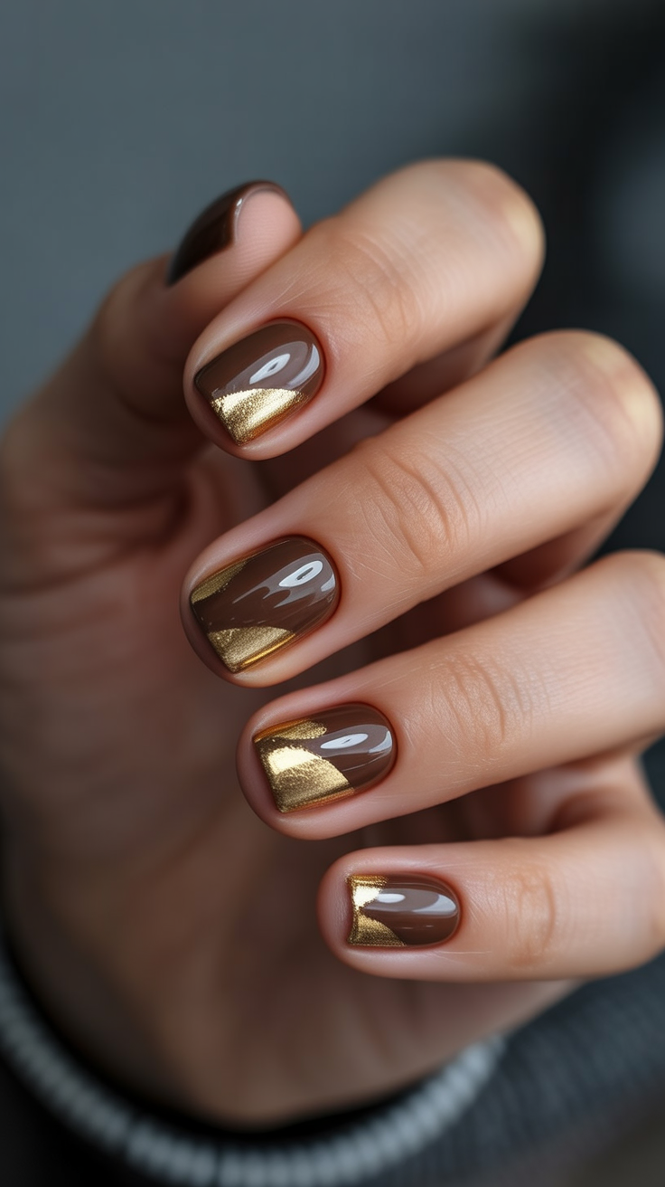 Rich, deep chocolate brown pairs with shimmering gold in a manicure that’s at once lavish and sophisticated. It’s a bit retro, a bit futuristic, but overall, completely chic. This look instantly polishes an outfit, whether it’s a coffee meeting or a holiday meal. Geometric gold angles refract just enough light that you find yourself stopped to appreciate your own fingers. Ideal for short acrylic nails, this look complements those who like a clean, classy silhouette with no fuss. The gold detailing is low maintenance and conceals chips, making this design practical yet fabulous. It looks great with gold accessories and natural makeup and exudes confidence with understated sophistication.