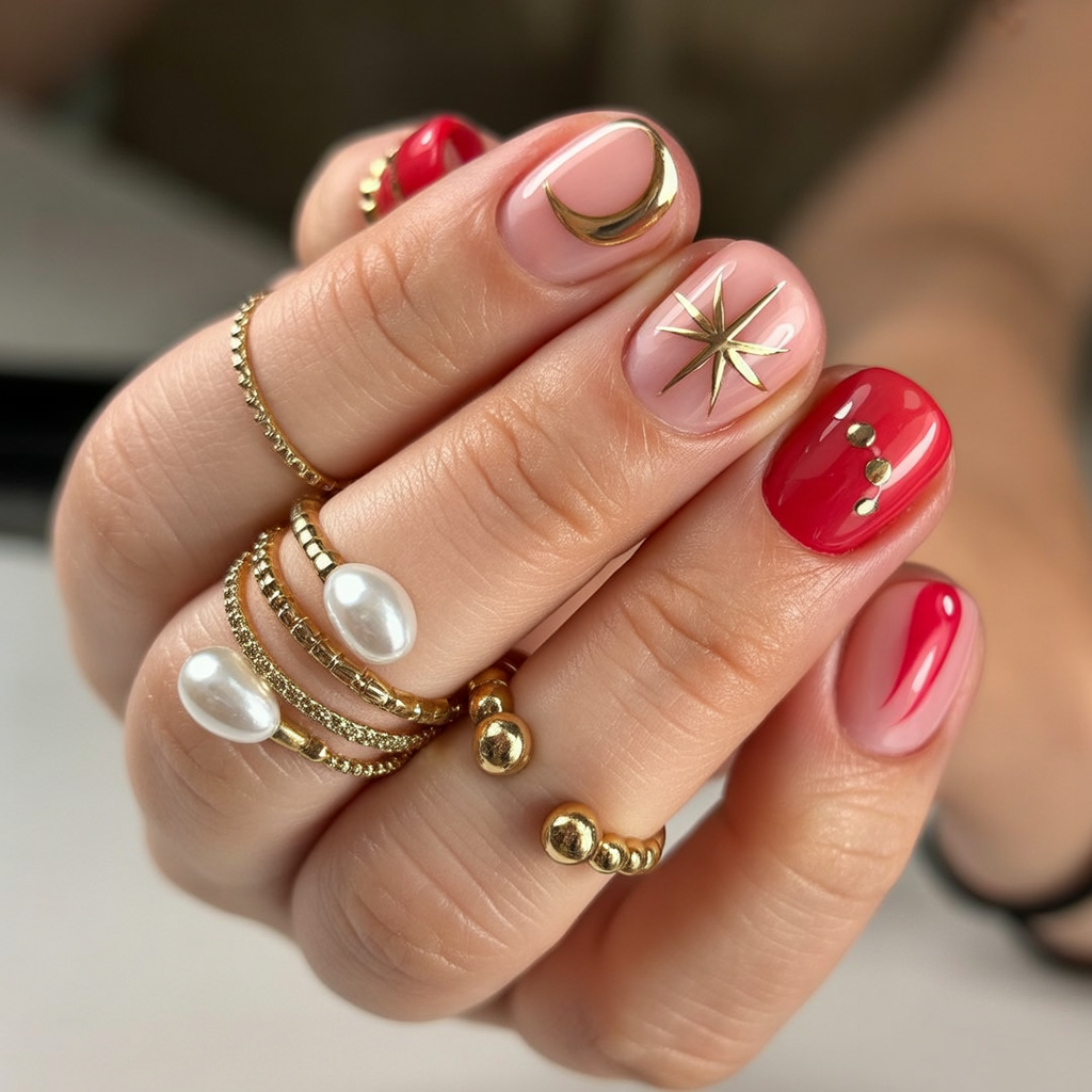 Whimsical yet luxurious, this celestial-themed design pairs red, blush pink, and gold for a manicure that’s as if plucked from a fantasy. Whimsical charm shines with the minute star and moon detailing, but the shiny red nails keep the look centered in bold femininity. It’s ideal for that woman who adores a taste of fantasy—the sort who perhaps never stopped making wishes upon a star. Best for short acrylic nails, it pairs with Valentine’s Day fever or your special night out. All skin tones are flattered with red and gold, as celestial elements give this look a hint of magic. Accent with gold rings or simple pearl accessories to maintain a cohesive, romantic look.