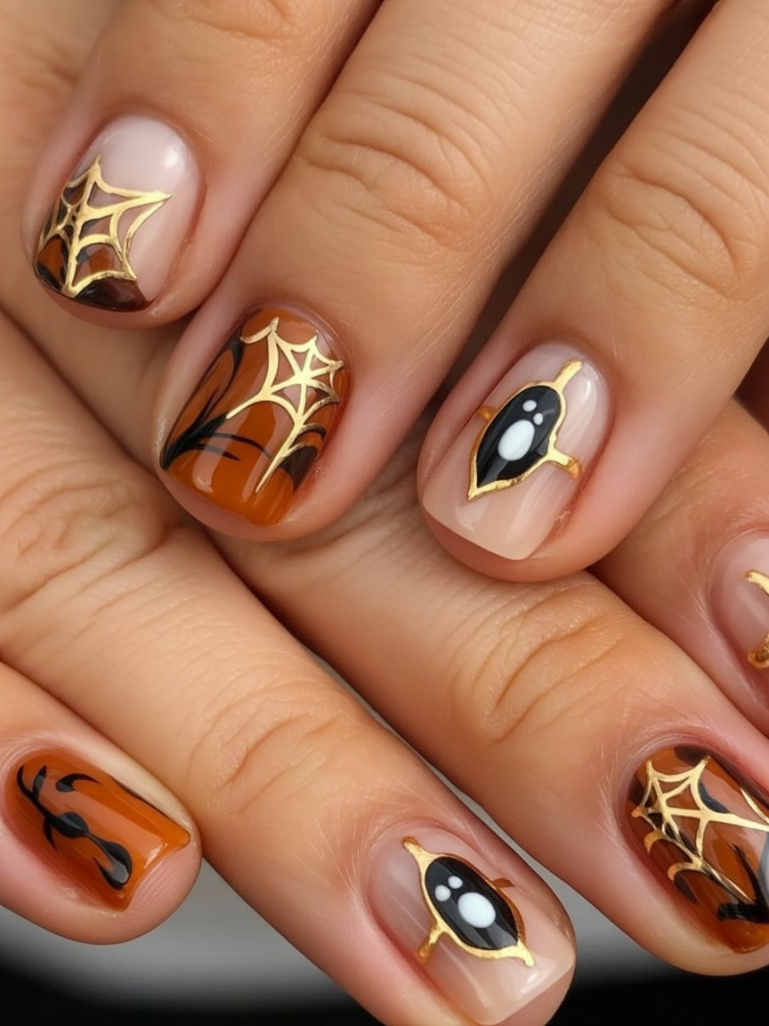 Why can’t spooky be glamorous, too? These Halloween-themed nails combine warm amber hues, black accents, and gold spider webs for a look that’s more high fashion than haunted attraction. It’s a look with personality—fun but sophisticated, bold but not costume-perfect. You could wear this at a fall party but still look great at Sunday brunch the next day. This design dazzles on short acrylic nails, perfect for anyone who adores seasonal themes but craves a sophisticated edge. With gold web and eye designs, it’s ideal for autumn or special occasion use, and it looks great with dark ensembles or with a sprinkle of metallic accents. It’s Halloween chic—dressed up, enigmatic, and completely fun.