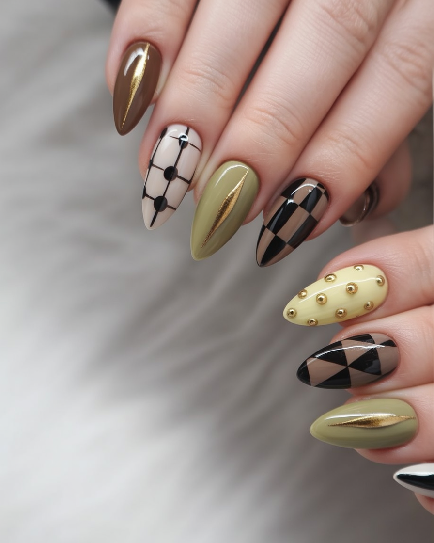 It’s art-meets-style on a plate, or rather, on your nails—creatively bold yet eye-stopping. Black-and-white checkerboard, olive green, and gold accents make for a retro, cool aesthetic that looks plucked straight from a ‘70s fashion spread. With a variety of finishes at hand—glossy, metallic, matte—a dimension comes across that’s brimming with individuality. Funky yet refined, this most assuredly isn’t your typical manicure.