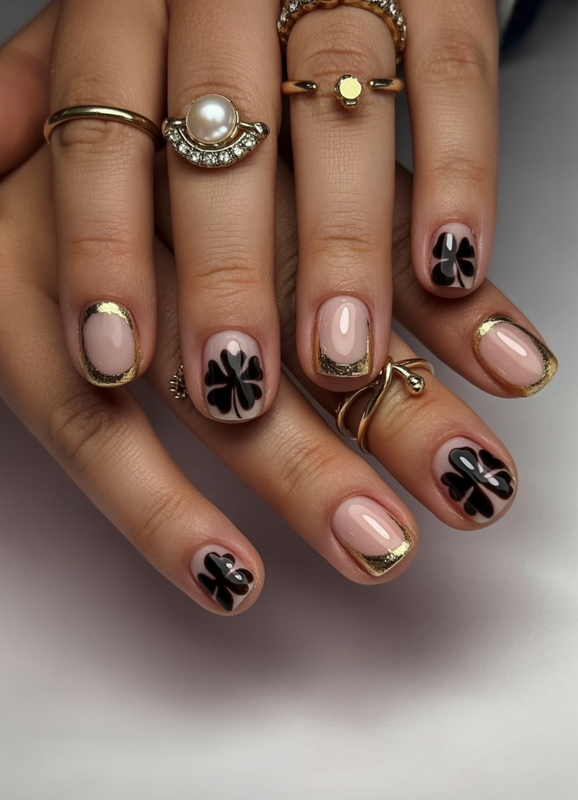 These nails exude the sort of quiet confidence that comes with knowing your style—refined, playful, and a bit mysterious. The thin gold edge lends a luxurious sheen to the nude base, but the black clover details hint at a slightly edgy, fashion-insider quality. It’s sophisticated yet relatable, like that trusty silk blouse with a leather jacket. This simple design looks stunning on short acrylic nails, perfect for any woman who enjoys low-maintenance nail shapes with high-end style. It’s suitable for daywear but stylish enough for a special occasion. Black and gold are a great combination that suits any skin tone, making it a classic must-have for 2026’s stylish nail trends.