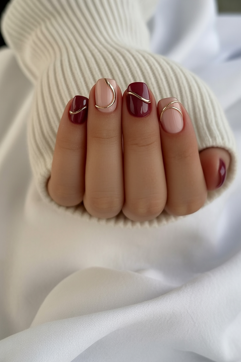 It’s like making a toast to sophistication with your fingers, or so it feels, with this combination of rich burgundy and muted blush hues, accented with gold wirework, that appears at once trendy and classic. It’s a masterful interpretation of a balance of boldness and delicacy, statement-making yet subtly sophisticated. Call it a piece of jewelry for your fingers, designed for the woman who adores a twist on elegance. Best for short acrylic or natural nails, this look pairs with cooler seasons and evening attire. This red and gold combination looks great with medium to light skin tones, making it a fabulous choice for a girls’ night out or even a sophisticated work event. You may keep your accessories simple—your nails do most of the communicating.