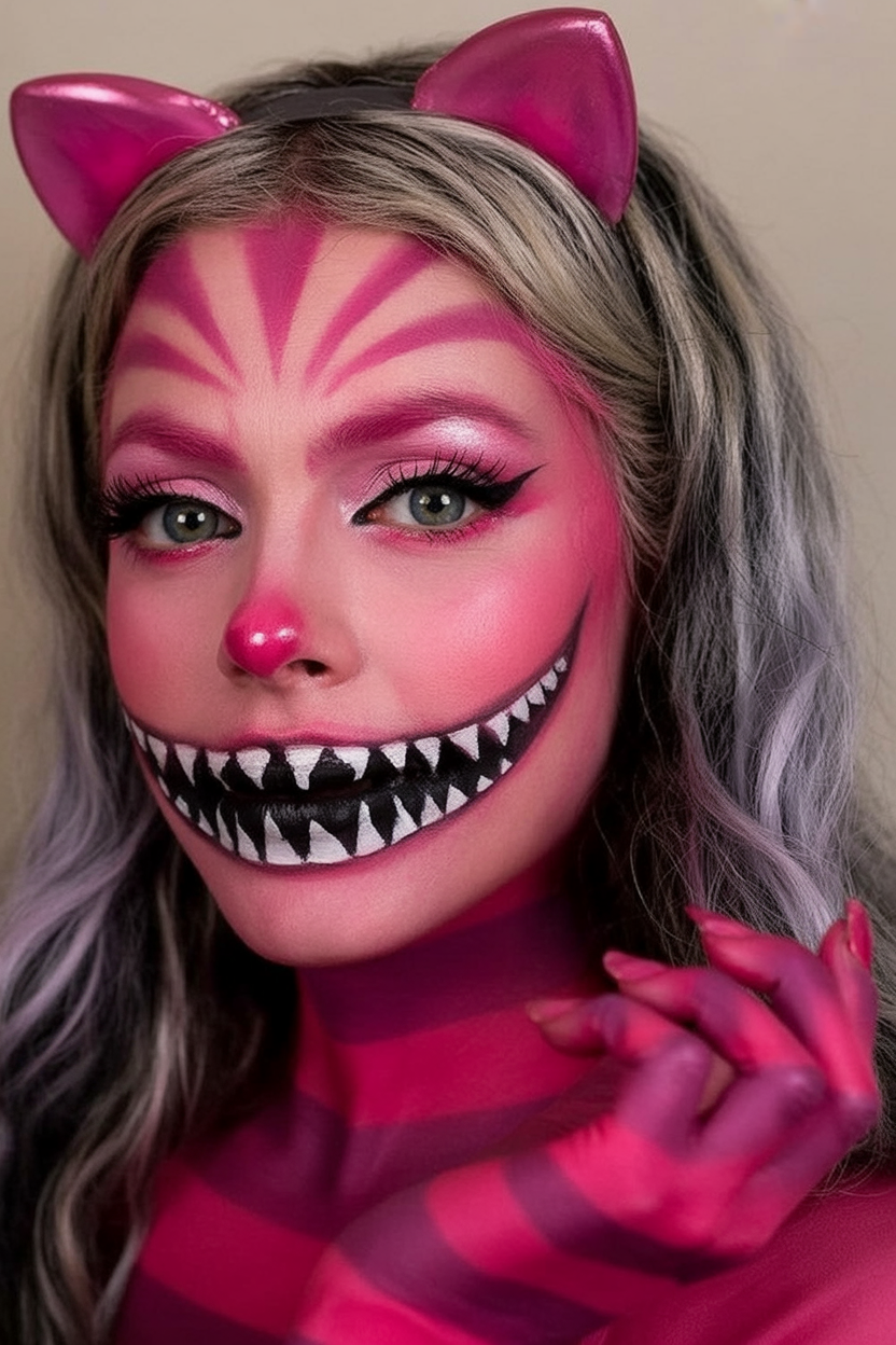 This look is pure wonderland chaos with a wicked twist — bold pink stripes, an oversized grin full of razor-sharp teeth, and that twinkle of mischief in the eyes. It’s playful and enfant, but make it unsettling. The shiny cat ears are the cherry on top of this storybook-gone-wild masterpiece.