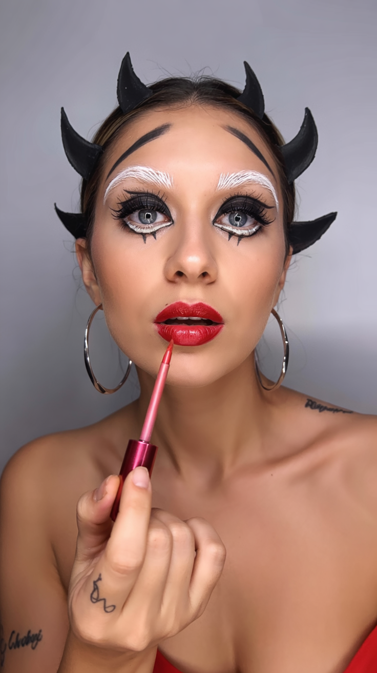 This look is pure campy devil delight! Between the high-arched white brows, doll-like lashes, and dramatic red lips mid-application, it’s giving playful evil queen energy — with just the right amount of sass. Those black horns pull the whole vibe together in a glam-meets-horreur statement.