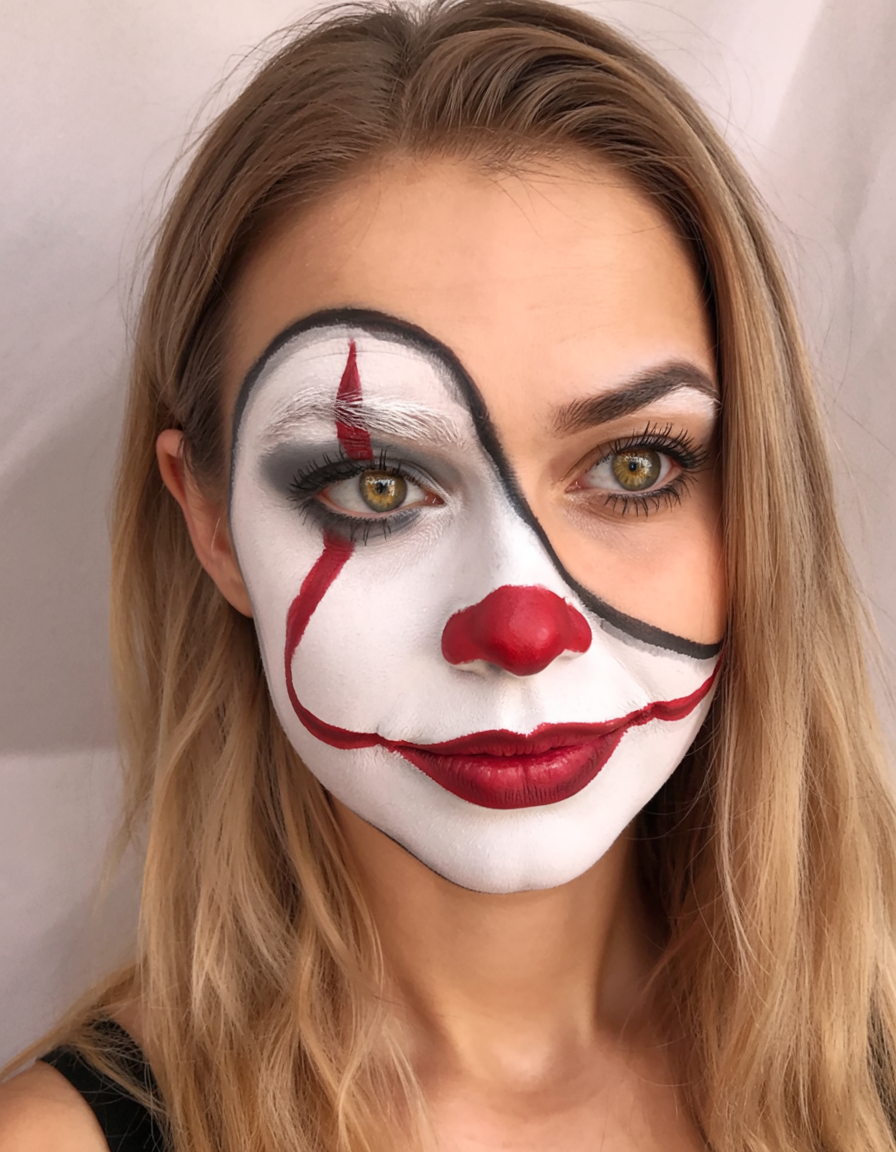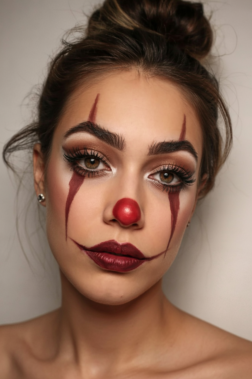 Who knew a squelette of a clown could look this elegant? The clean lines, minimal red detailing, and precision eyeliner give this classic Halloween look a sultry update. The tiny red nose keeps things playful, while the matte burgundy lips add just the right amount of grown-up flair.