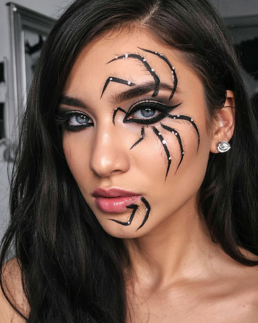 Edgy and alluring, this spider web design is sharp and clean with a dash of drama. Black tendrils sweep across the face like gothic lashes — perfect for a glamorous sorcière or spider queen vibe. It’s high drama without going over the top.